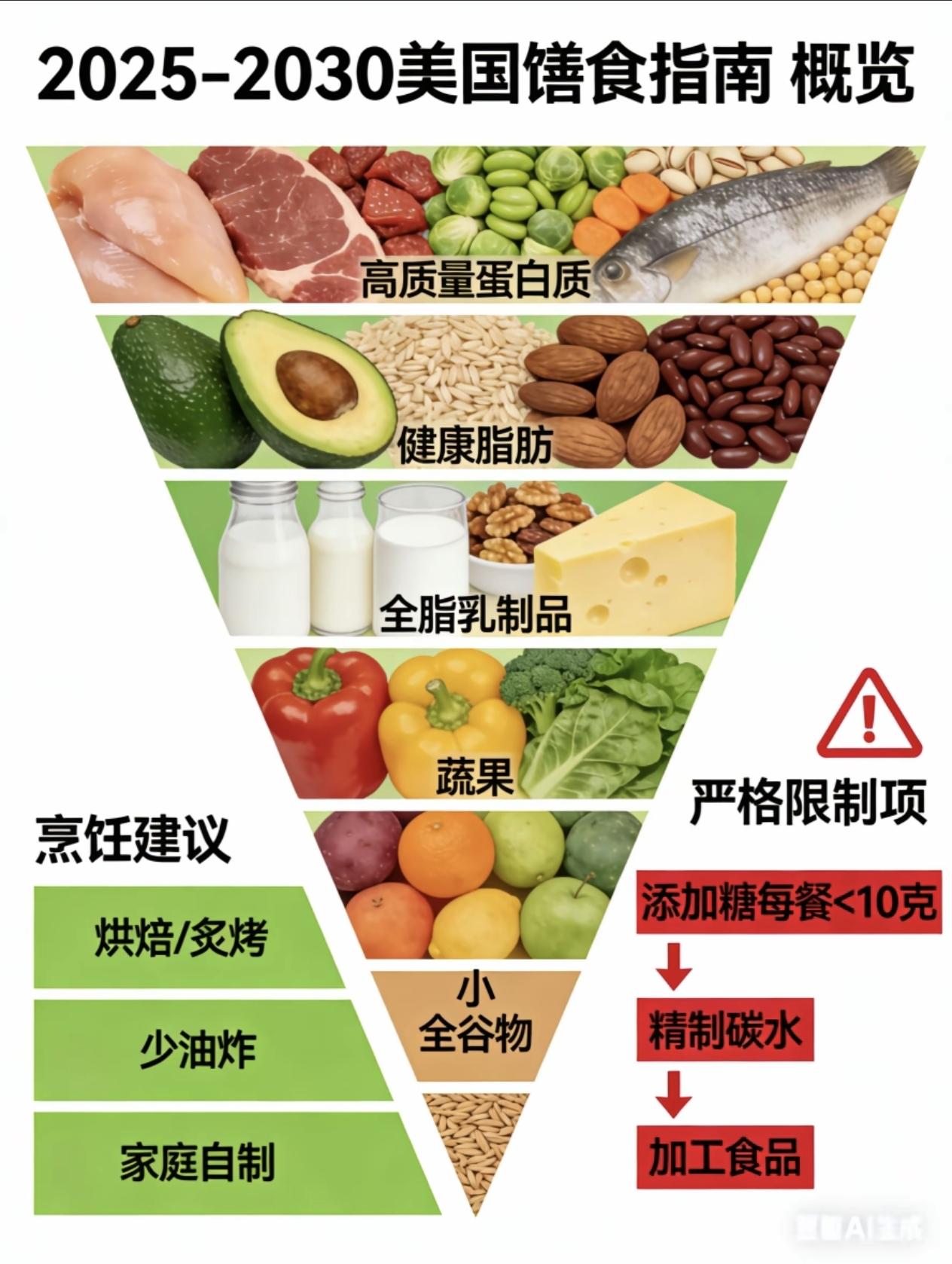 回归本源的饮食觉醒 新版《2025-2030美国膳食指南》的发布,不仅是营养学建议的调整,更像是一场对现代饮食文化的深刻反思。其核心“吃真正的食物”如同一记警钟,将我们从对“营养素计算”和“超加工食品”的迷思中唤醒。 这份指南最大的颠覆,在于它从“成分论”回归到“食物论”。它不再仅仅让我们盯着卡路里、脂肪或碳水化合物的数字,而是直接指向了食物本身的质量。它旗帜鲜明地反对那些充斥着化学添加剂、高糖高盐的“伪食物”,鼓励我们选择天然、完整的食材。这让我意识到,真正的健康并非来自实验室调配的营养补剂,而是源于大自然赋予的、带着生命气息的食物。 另一个深刻的触动是它对“便利”的重新审视。指南大力倡导家庭烹饪,这在快节奏的当下显得尤为珍贵。它提醒我们,每一次走进厨房,都是对自身健康的一次主动掌控。当我们亲手挑选新鲜的蔬菜、优质的蛋白,并用心烹煮时,我们不仅是在摄取营养,更是在重建与食物、与家人的连接。 这份“倒置”的指南,实则是将颠倒的饮食观念重新扶正。它告诉我们,健康并非遥不可及的复杂公式,而是蕴藏在最朴素的真理中:远离工业加工的过度干预,回归天然,回归厨房,回归对食物最本真的尊重。这不仅是膳食的调整,更是一种生活态度的觉醒。