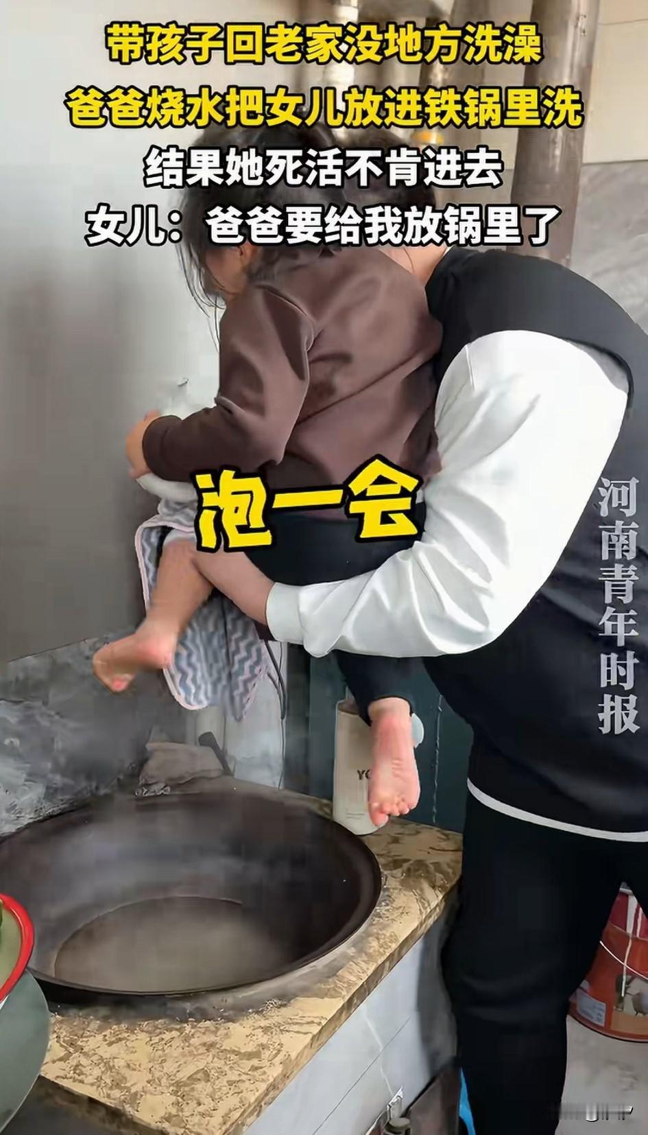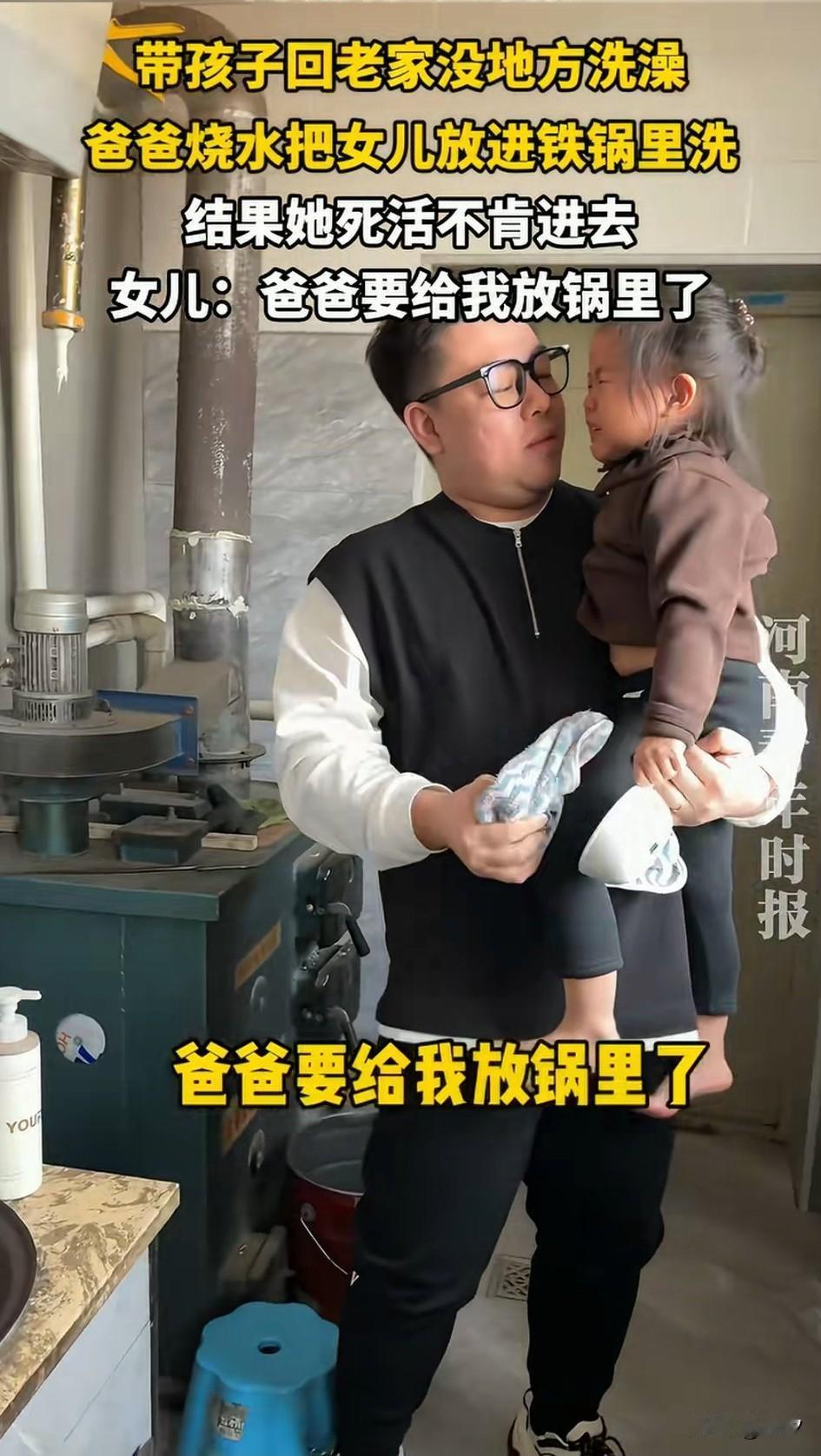 万万没想到跟着老爸回老家,老爸居然要把我放锅里,这孩子怕是被吓住了,差点以为老板要把他煮了! 小陈一直在城市生活,后来在城市结了婚,买了房,他的孩子也出生在了城市,孩子今年三岁多了。 之前一直很少回老家,由于爸妈这次没有来城里过年,他和媳妇儿就回老家过年,带着3岁的宝宝一块回的老家! 孩子回到农村老家后开心坏了,不仅能和村里的小朋友玩,还可以和村里的小动物一块玩耍? 过了几天之后,他就为洗澡开始发愁了,因为村子离镇上澡堂非常远,他就想着给自己的女儿洗个澡,于是就将大锅支了起来! 还往里面加了不少水,记得小时候自己也是这样洗澡的,就要给自己的小姑娘洗澡,小姑娘看着自己的爸爸所作所为, 我以为爸爸要给他做大餐,结婚没想到爸爸抱着她就往锅里放,这可把她吓坏了,拽着老爸就不松手,急的眼泪一下就流了出来! 不停的喊着妈妈,爸爸要把我放锅里了,现在的小朋友多聪明,动画片都看多了,放锅里很危险都知道! 女儿的举动把爸爸都逗笑了,试了好几次就是把她按不到锅里,小孩的求生欲也是很强的,在旁边的妈妈都被这一幕逗得笑弯了腰! 大家对于农村把孩子放锅里洗澡这事怎么看? 回老家 在城市打拼过的你,还回老家养老吗?
