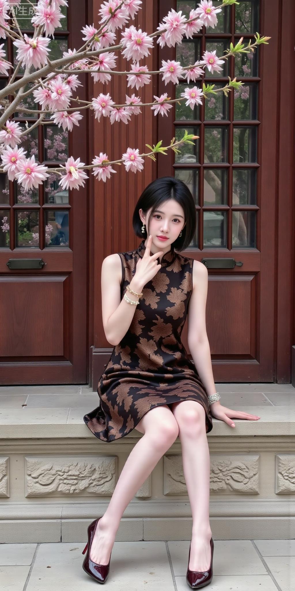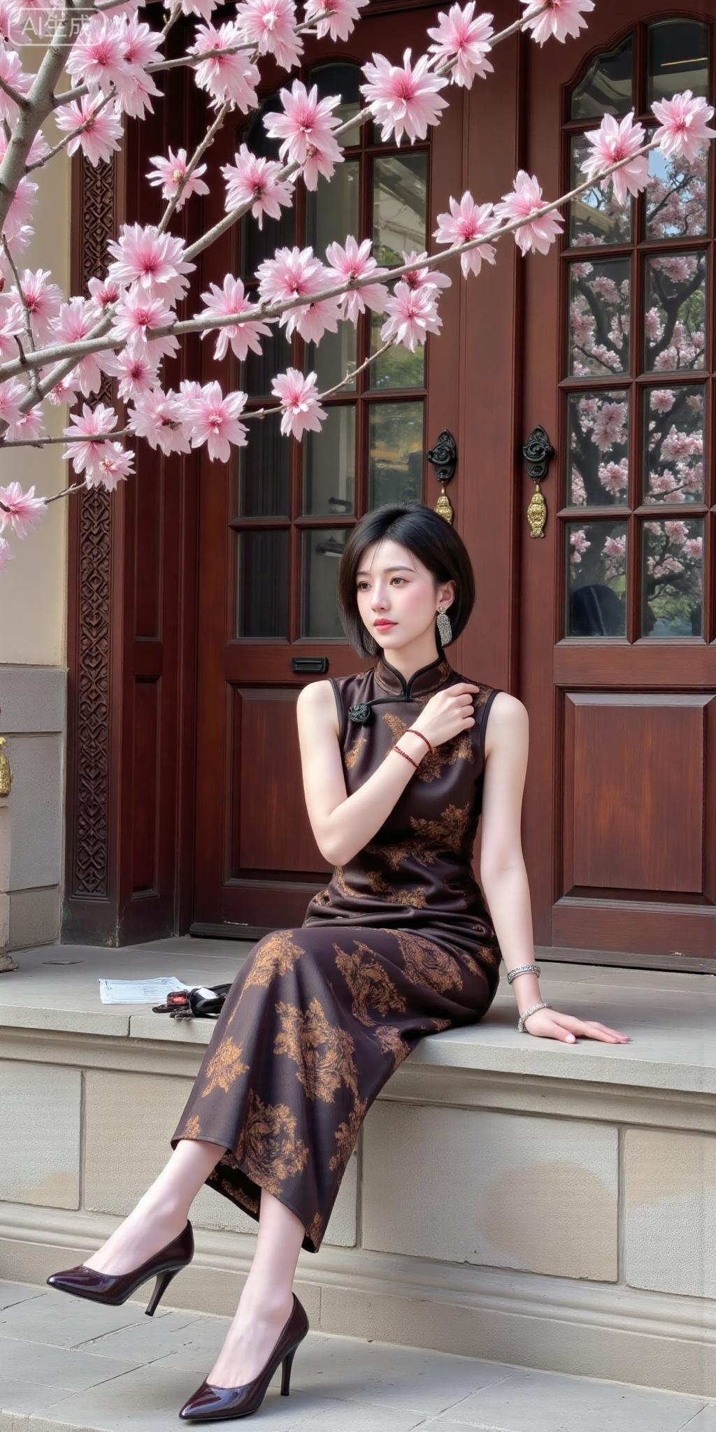 旗袍美人与春樱的适配度满分 深棕缎面旗袍衬着金纹,清冷又贵气~短发配玉坠耳饰,腕间红绳添了点柔媚,身后粉樱落在古铜门上,像从旧时光里走出来的氛围感美人✨玫瑰花旗袍写真