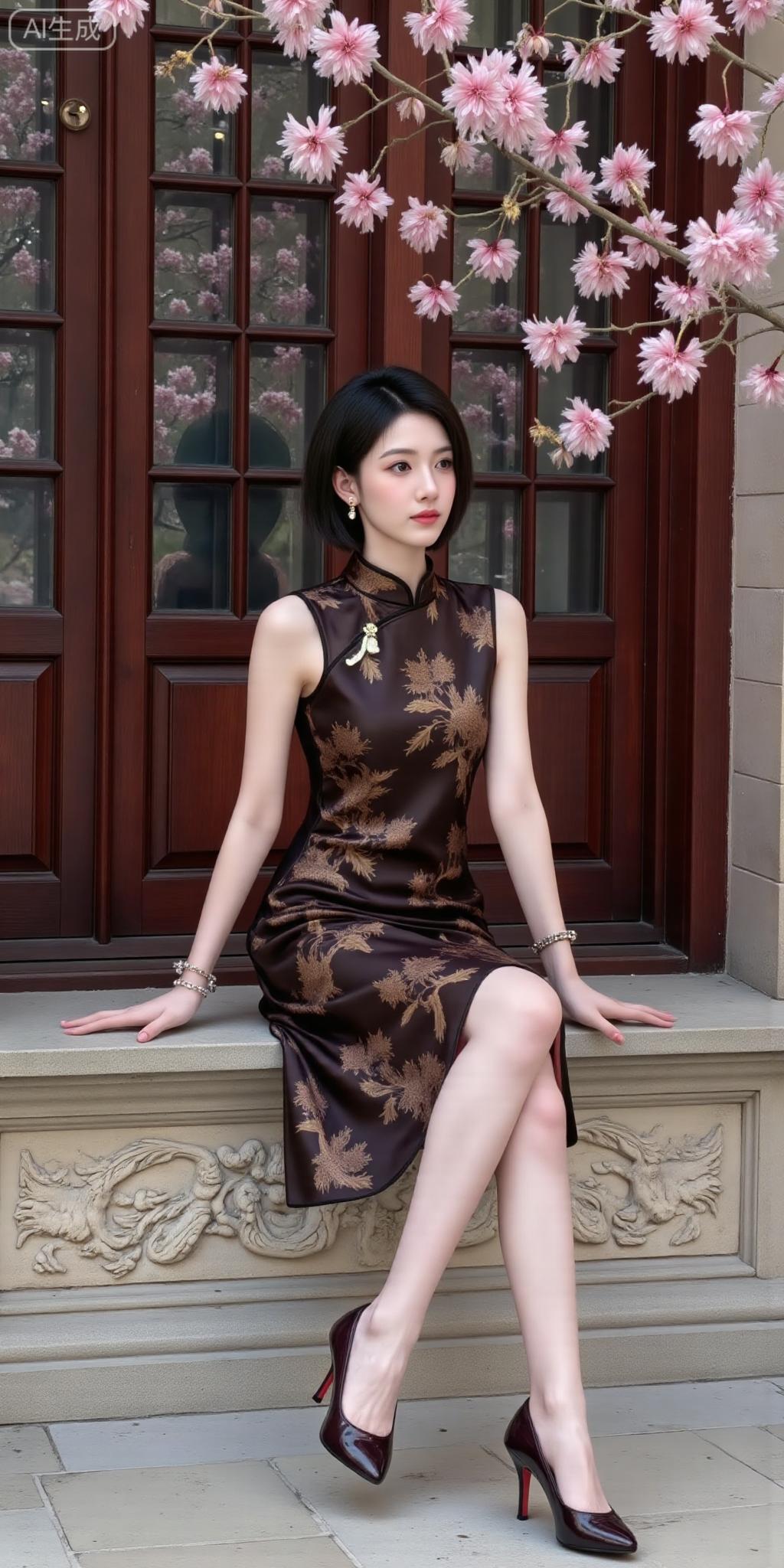 旗袍美人与春樱的适配度满分 深棕缎面旗袍衬着金纹,清冷又贵气~短发配玉坠耳饰