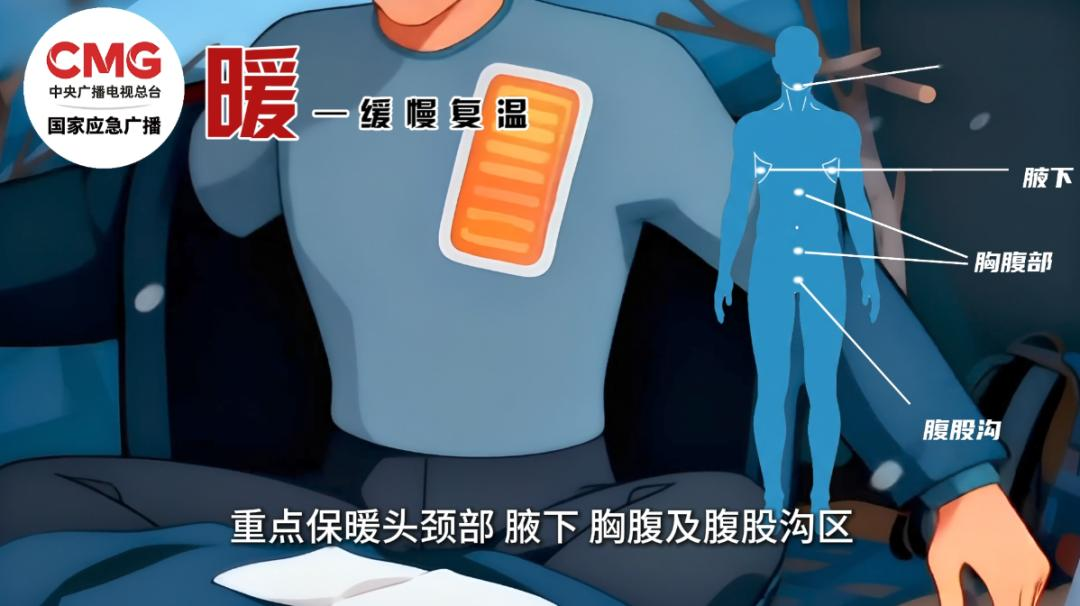 暖:更换干燥衣物,用睡袋、保温毯包裹身体,重点保暖头颈部、腋下、胸腹及腹股沟区,可使用不超过40℃水袋或热敷包,置于大血管走行处,千万不要直接使用热水或过高热源,以免引发外周血管扩张,导致循环衰竭。