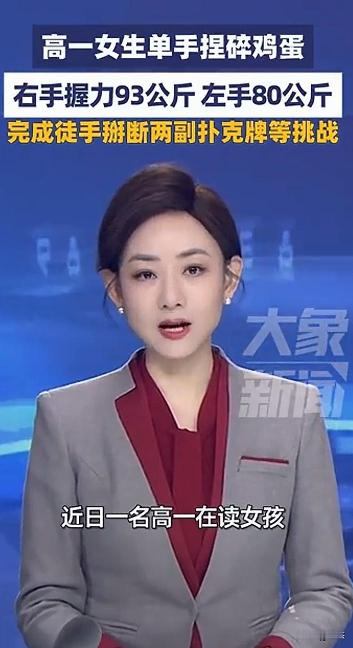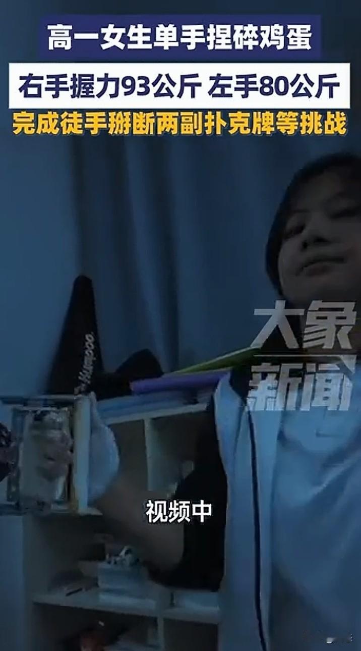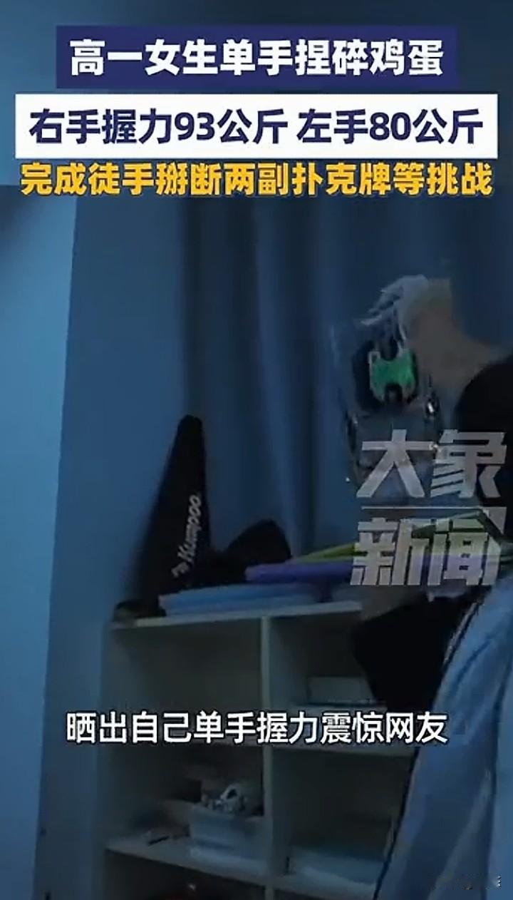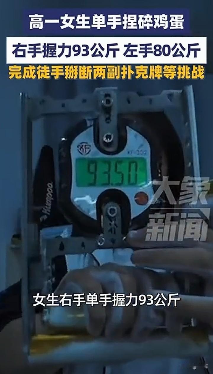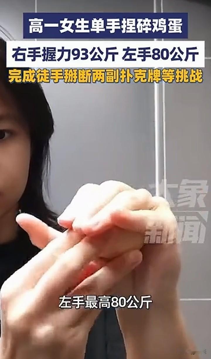 不敢相信,高一女生单手捏碎鸡蛋,握力惊人,右手手的握力93公斤,左手80公斤的握力。女生把视频发到网上,引起广大网友热议和关注。 不敢想象那得多大的力气啊,想想都觉得不可思议,更让人惊讶的是,女生居然能徒手扭断两副牌。 不得不佩服女生的力气,我相信这握力没有长时间的练习是不可能那么厉害的。 你们怎么看呢?这握力是不是很强?