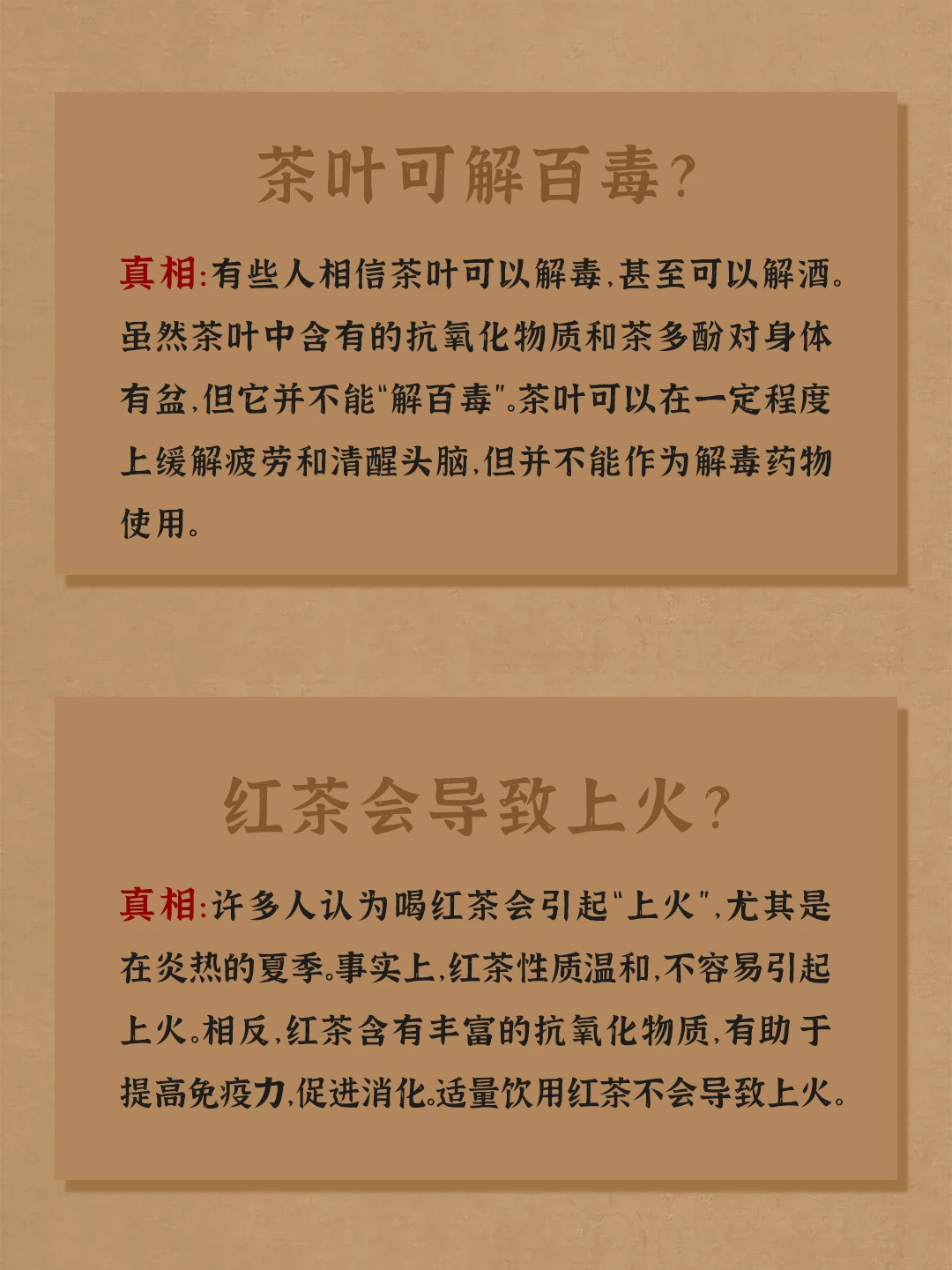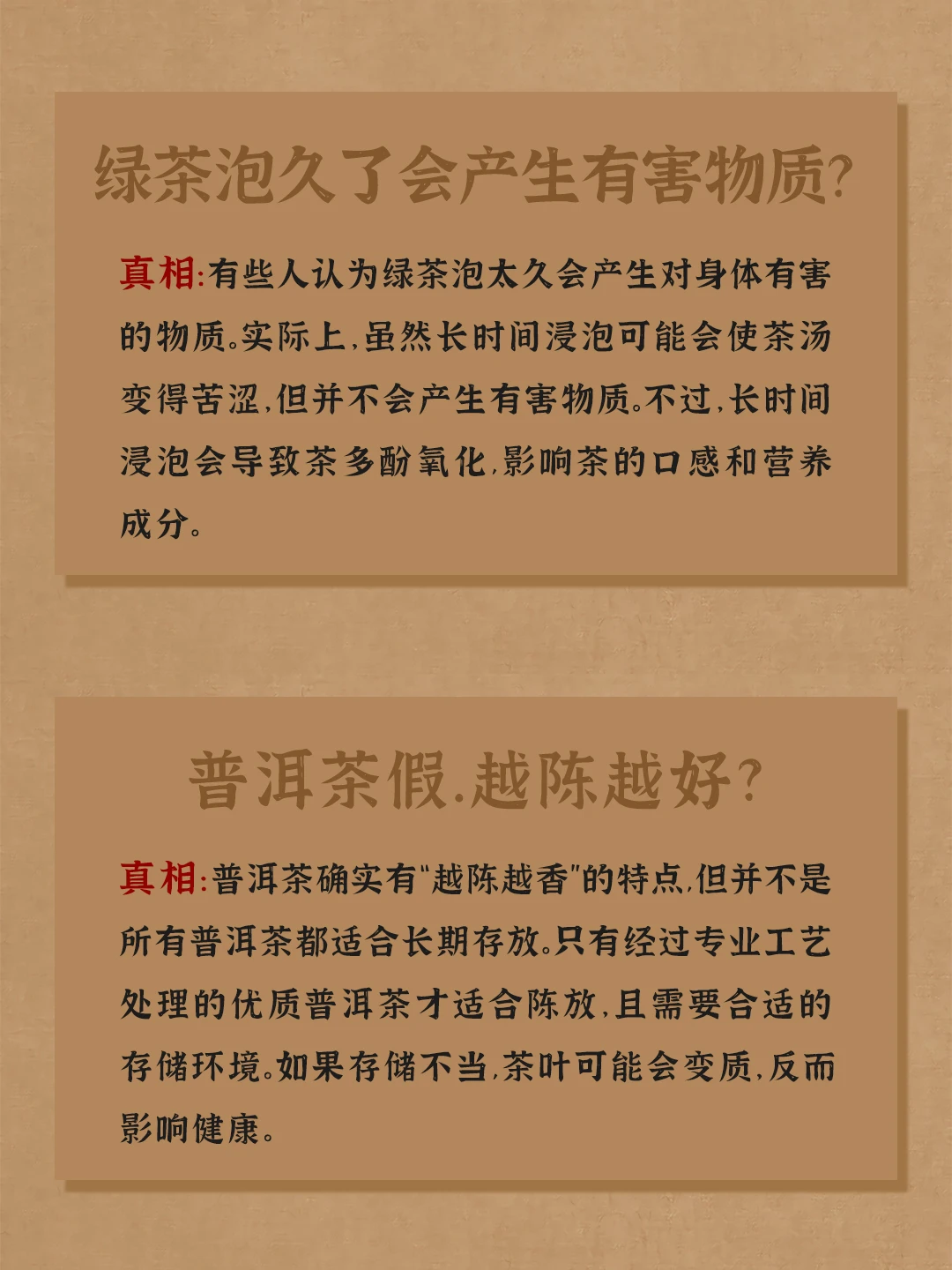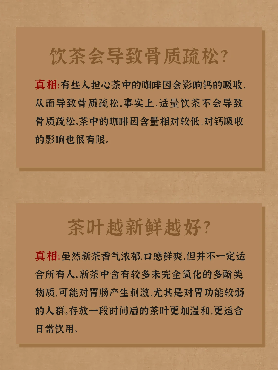 1.茶叶可解百毒? 2.红茶会导致上火? 3.绿茶泡久了会产生有害物质? 4.普洱茶假.越陈越好? 5.饮茶会导致骨质疏松? 6.茶叶越新鲜越好?