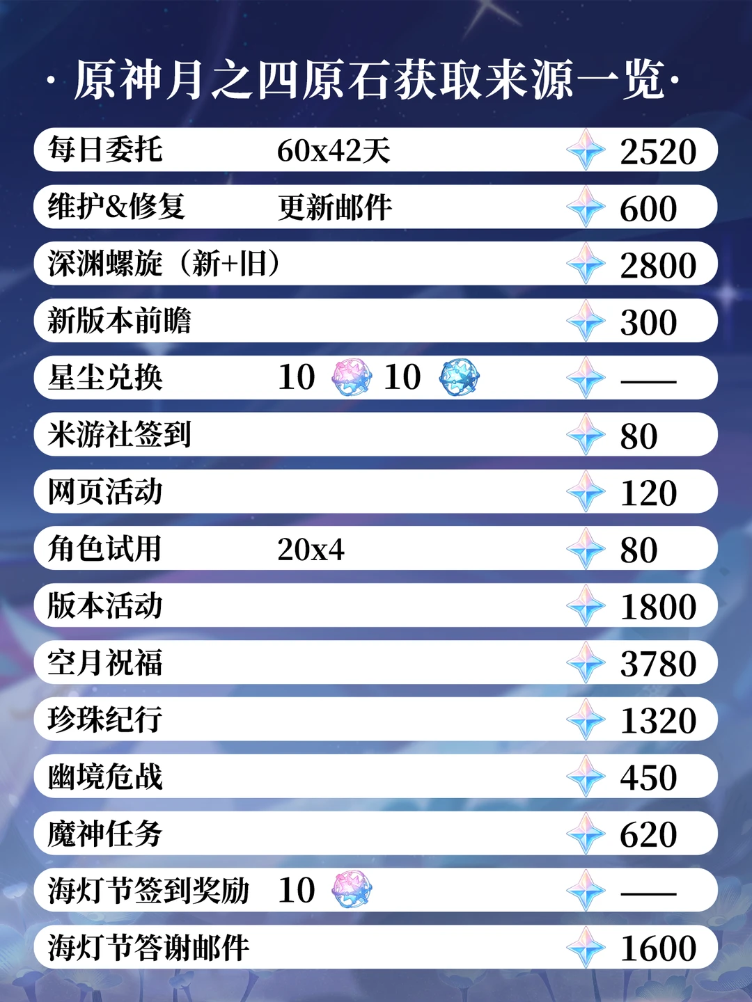 挪德卡莱「月之四」版本原石统计汇总表攻略来啦 新5️⃣⭐月神哥伦比娅/兹白+新4️⃣⭐叶洛亚+五⭐复刻角色伊涅芙+那维莱特即将上线 ✨来看看你保底能获得多少抽吧: 零氪:85粉球+17蓝球 小月卡:109粉球+17蓝球 大月卡:121粉球+17蓝球