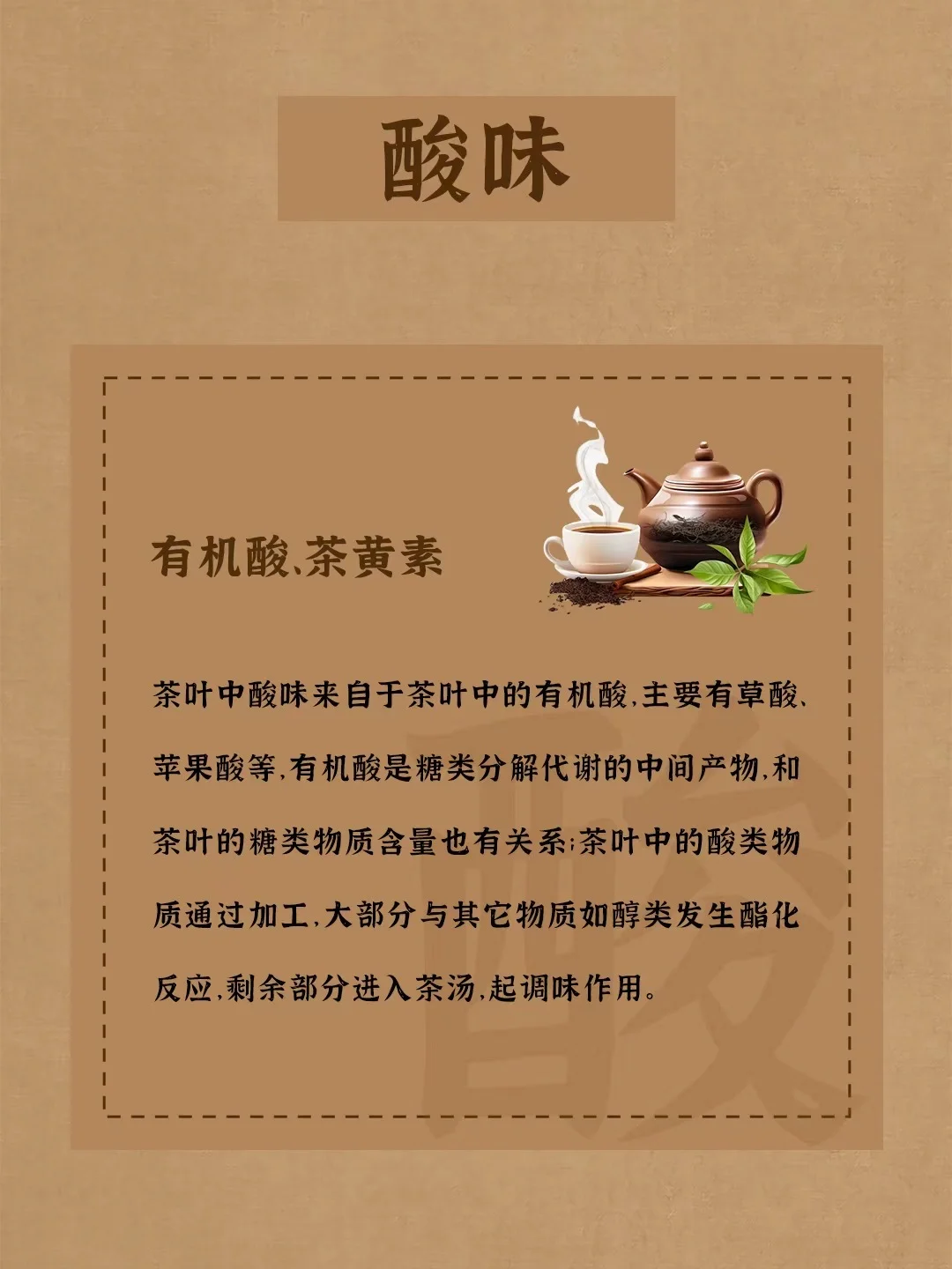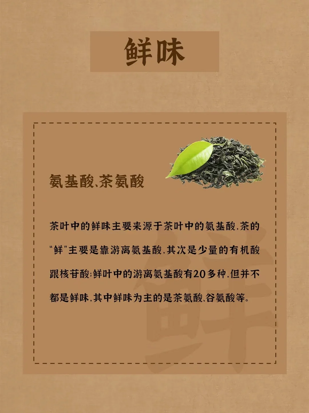 食有五味,分别是酸、甜、苦、辣、咸。而茶也有五味,一杯美好的茶汤就是茶中五味完美融合的结果。 茶中五味实际上是茶叶中呈味物质相互协同的反应。 茶叶中的呈味物质归纳起来大致可分为:苦味、涩味、鲜味、甜味、酸味。