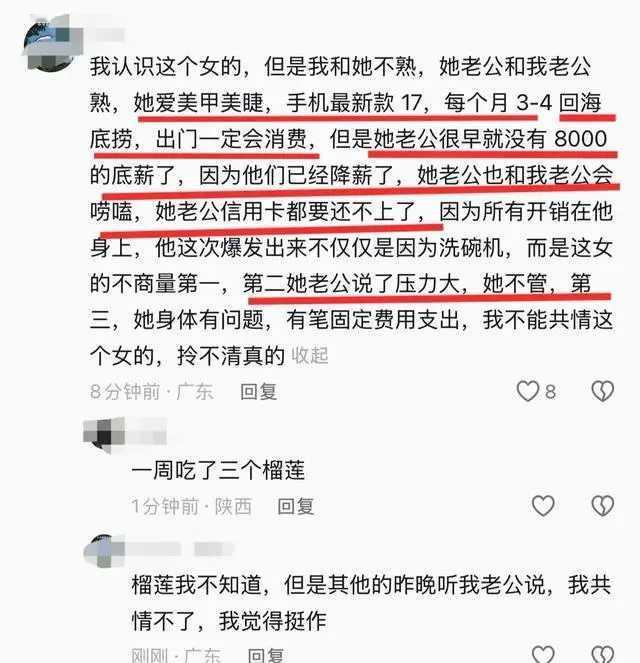 家里有外债,只有男人一个人上班,女的在家闲着。女人嫌洗碗太冷就买了一台洗碗机,男人大怒把家里桌凳砸了,女人上网哭诉还得到了好多人的支持。后来据说反转了,女的好吃懒做,目前全靠男的赚钱养家,女的没工作,家里环境本身就脏乱差也不收拾,隔三差五做美甲吃海底捞。 我只想说:该离婚离婚,不是女人挣不挣钱的事儿,而是作为夫妻,有没有把家庭的事看做一个共同目标。三观不合,这次不离以后也没好日子过。