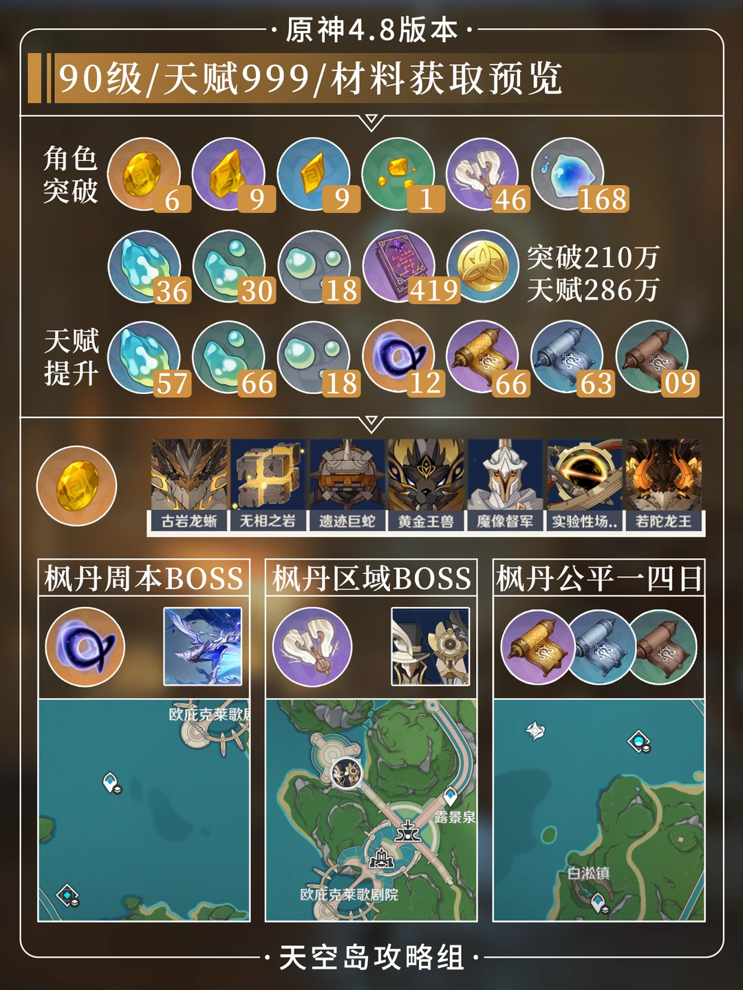 4.8版本娜维娅上半复刻,看看你还缺什么材料?[哇R] 包括了初露之源和原海异种路线图 推荐队伍中带林尼,会在小地图里标注材料 ——————————————— 提升角色等级和天赋: 需要打枫丹周本boss吞星之鲸 枫丹boss科培琉司 刷枫丹周一/四秘境“公平”