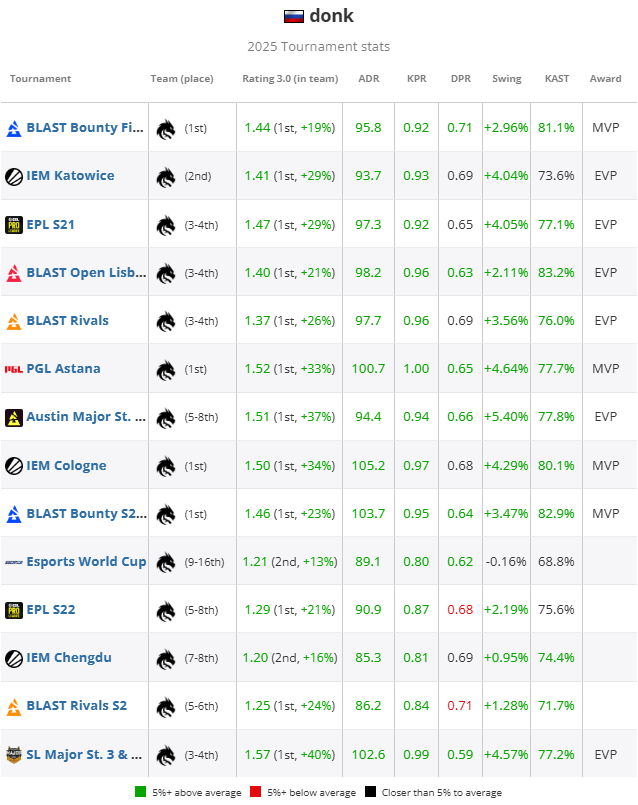 赛季就此以队伍迄今为止最差战绩告终,而donk则保持了奖项的连续纪录,在赛季七项赛事中获得第七个荣誉——他以1.51的赛事rating远超队友,获得了一个强劲的EVP。