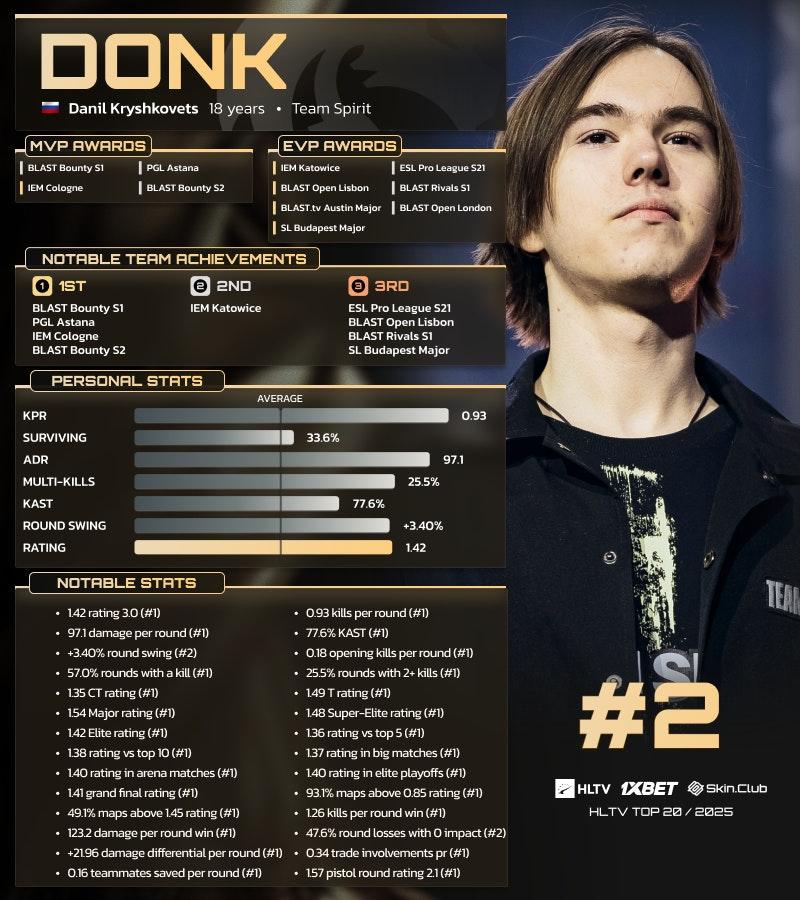 donk在2025年交出了无人能及的原始数据,从而确保了其在榜单上的第二位。这些数据体现在他参加的15项赛事中斩获11个奖项,另有三次以毫厘之差失之交臂,其中包括在Spirit的每场胜利(BLASTBounty第一赛季、PGL阿斯塔纳站、IEM科隆站和BLASTBounty第二赛季)中都荣膺MVP。