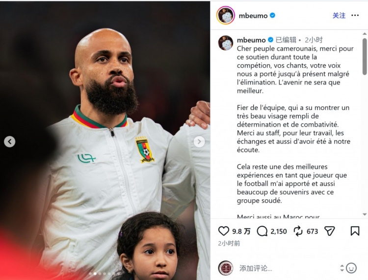 喀麦隆前锋姆伯莫社媒写道:“亲爱的喀麦隆民众,感谢你们在整个赛事期间给予的支持,你们的歌声和呐喊一直支撑着我们走到现在,尽管我们被淘汰了,但未来只会更好。”