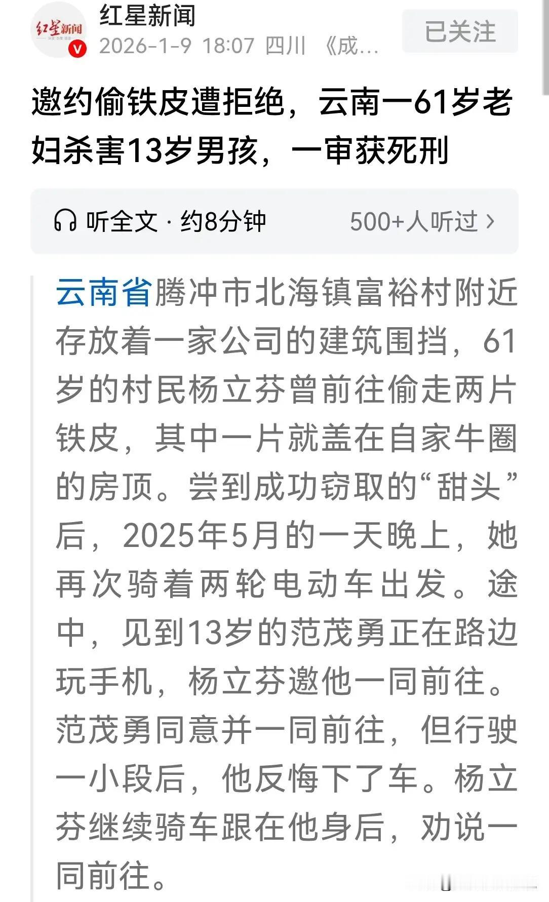 在云南腾冲的山水之间,有一段令人扼腕叹息的悲剧,也是一面镜子,映照出人性善恶的交织与健康的真谛。61岁的老太太,为了那一片铁皮,竟然走上了偷窃的歧途。可谁曾想,这一切的起因竟是对生活的无奈与迷茫?人生如逆旅,我亦是行人。她或许早已忘记了,真正的健康,不只是身体的强健,更是内心的平和与感恩之心。 在那天的街头,老太遇到孙子的同学,天真无邪的13岁男孩。她一时冲动,邀请他同行,却又反悔,双方争执不休。人生如棋,局局皆是风云变幻。老太用衣服捂住男孩的口鼻,令人扼腕的瞬间,悲剧发生了。她没有选择救助,反而将男孩的身体推入河水,留下无尽的哀伤与反思。这样的行为,令人痛心,也让我们深思:健康的内在修养,远比外在的物质更为重要。 事情发生后,警方和家属四处搜索,像是在寻找一颗失落的明珠。而老太太的隐瞒,更像是在黑暗中点燃一把火,照亮了人性中的阴暗角落。最终,法院判决老太太故意杀人,判处死刑,彰显法律的公正与铁血。然而,她提出上诉,也让我们看到,人性复杂,善恶交织。 这起悲剧,提醒我们:真正的健康,是内外双调。内在的善良与感恩,才能抵御外界的诱惑与黑暗。我们要用感恩之心,善待自己,善待他人,用正能量点亮生命的每一寸光辉。只有心怀感恩,懂得回馈,才能拥有身心的健康,迎来人生的春天。 让我们记住:人生如行云流水,健康如青山绿水。只要心中有感恩,身心皆健康;只要心存善念,人生便是大美无疆。愿每一个人都能在平凡中修炼出不平凡的内在力量,用爱与善良点缀人生的每一个角落,迎接属于我们的光明未来。 刺痛人心的悲剧