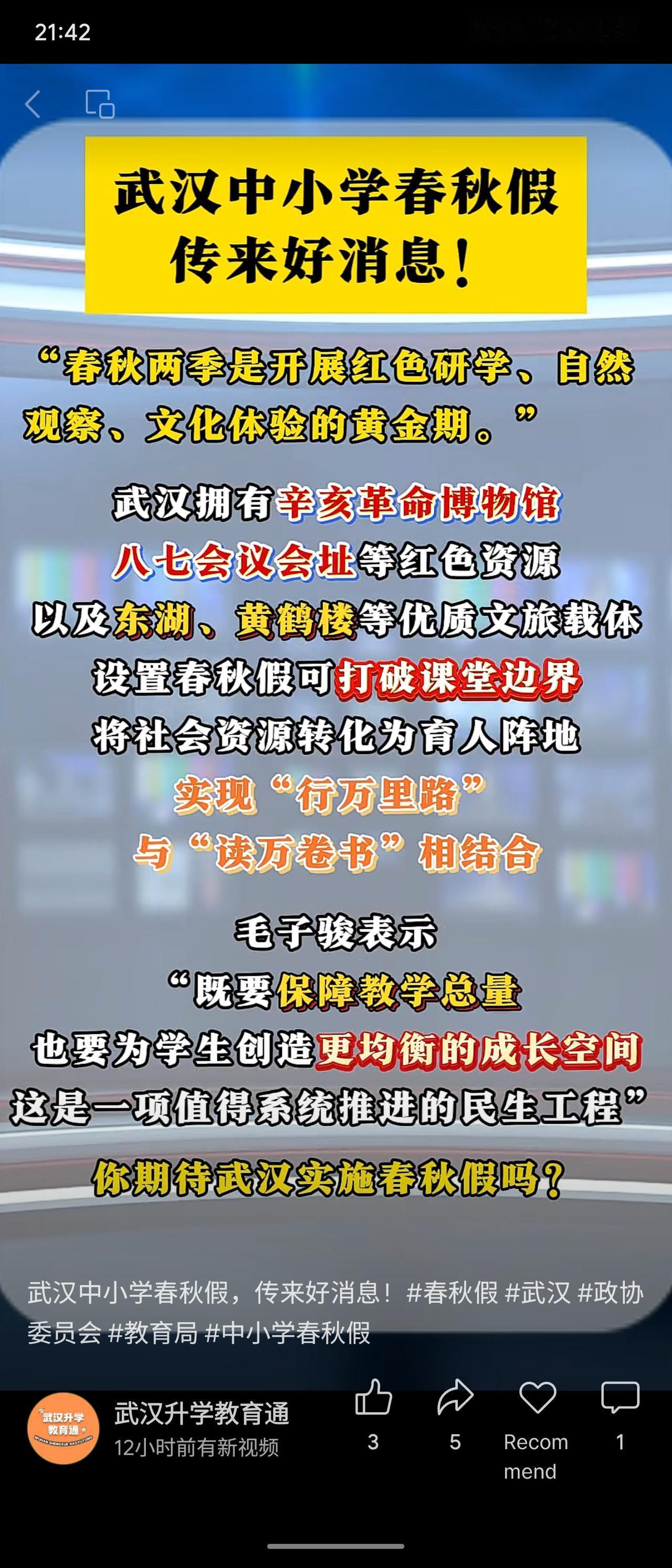 武汉市政协委员提案研究中小学春秋假设置,已获立案。提案指出春秋假有利于学生全面发展、促进文旅消费,可利用武汉丰富的红色与自然资源,实现“行万里路”与“读万卷书”相结合。