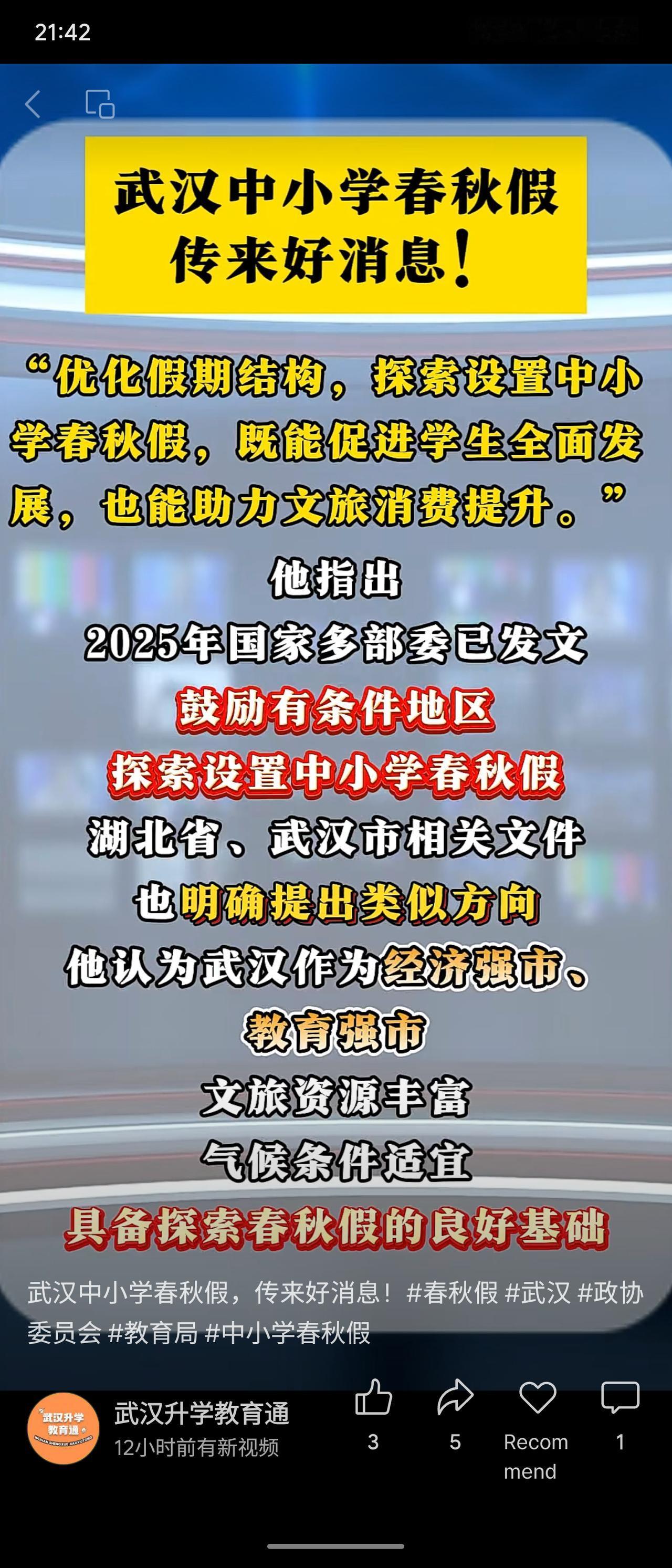 武汉市政协委员提案研究中小学春秋假设置,已获立案。提案指出春秋假有利于学生全面发