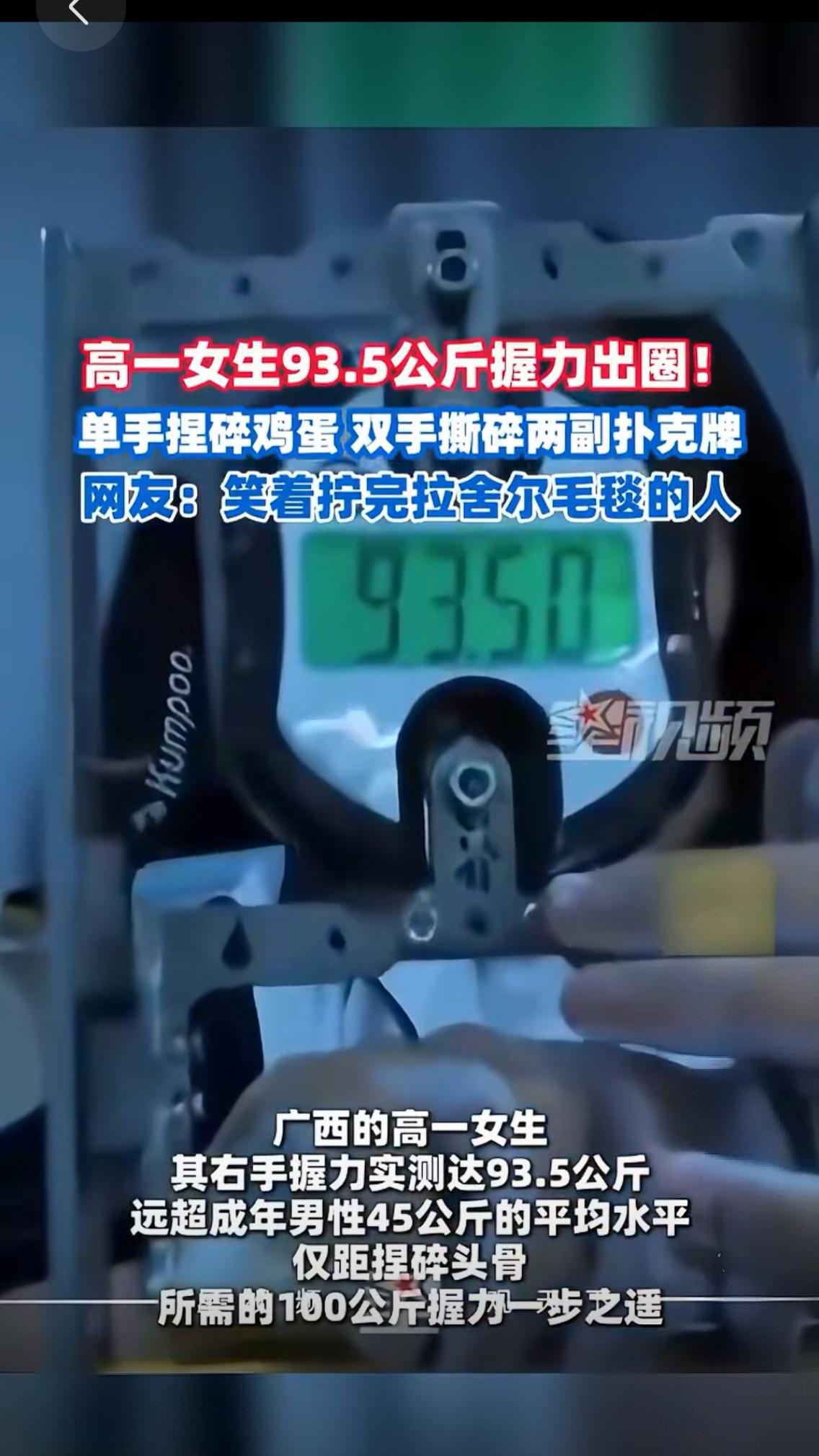高一女生93.5公斤握力封神!单手捏碎鸡蛋,手撕两副扑克,网友:拉舍尔毛毯终于有救了 近期,抖音博主“邪恶猫猫”凭借惊人手劲引发全网关注。这个看起来清秀腼腆的高一女生,右手单手握力飙至93.5公斤,左手也达80.05公斤,单手捏碎生鸡蛋、3秒捏变形尖嘴钳,就连网友调侃“需练四年”的双手撕碎两副扑克牌,她仅用两天就成功解锁,被网友戏称“人形液压机”。 93.5公斤的握力到底有多恐怖?一组数据对比直击人心:我国成年男性平均握力仅40-45公斤,成年女性中位数才24公斤,17-19岁男性平均握力也不过48.3公斤。也就是说,这位16岁少女的握力不仅是成年男性的两倍多,远超同年龄段男生,甚至接近理论上捏碎头骨所需的100公斤握力,距离世界女子握力纪录98.3公斤也仅一步之遥。 这份“神力”并非天生。早在初二,她就测出62公斤握力,远超同龄女生25公斤左右的平均水平。作为学校拔河队主力,她每周坚持三次针对性训练,哑铃弯举、握力器练习从不间断,练坏的握力器不计其数,手上的茧子起了又破。从去年10月的52.85公斤到如今的93.5公斤,她用两个月时间完成了别人可能几年都达不到的突破,每周近1公斤的握力涨幅堪称“赛博进化”。 更难得的是,这位“力王少女”不仅力量出众,学习成绩也十分优秀,性格开朗的她还经常帮同学拧瓶盖、搬书,成为校园里的励志榜样。她的走红,不仅让“拧拉舍尔毛毯”成为网友热议的趣味挑战,更打破了“女生练力量会变粗、长不高”的刻板印象。北京体育大学专家解释,13-18岁是青少年力量增长的黄金窗口,科学训练能有效激发身体潜能,还能提升骨密度,降低运动损伤风险。 反观当下,很多青少年面临“重而弱”的体质危机,体重上升但握力下滑,跑两圈就气喘吁吁。“邪恶猫猫”的故事恰恰证明,青春的力量从不是柔弱的代名词,而是日复一日的坚持与热爱。网友们的评论既有趣又暖心:“别人吵架讲道理,她吵架追着握手”“这才是真正的少女力天花板”“建议批量生产她的同款握力秘籍”。 从质疑仪器故障到全网追捧,这个16岁女生用实力告诉我们:所有看似开挂的天赋,背后都是咬牙坚持的付出。你是否也被这份青春力量打动?握力