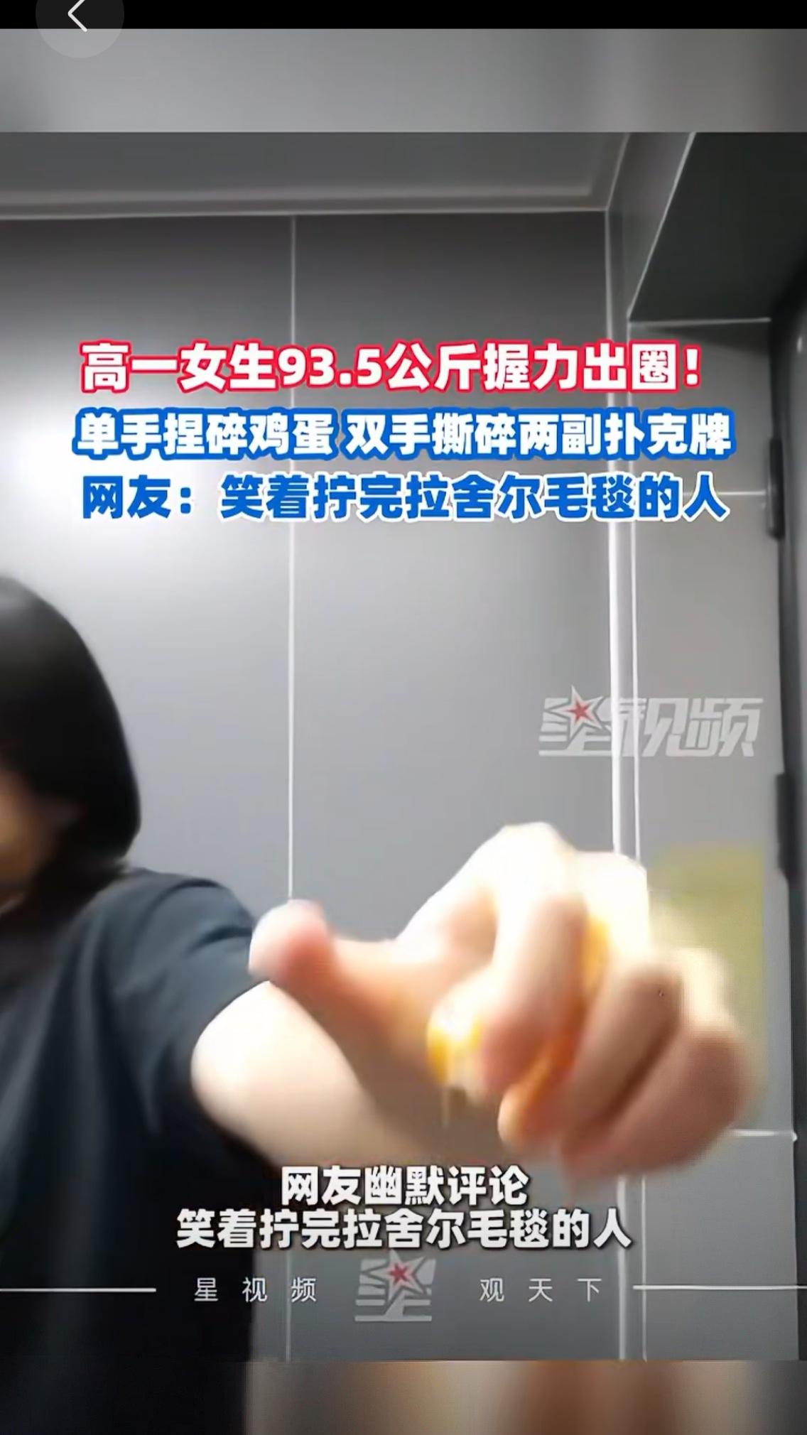高一女生93.5公斤握力封神!单手捏碎鸡蛋,手撕两副扑克,网友:拉舍尔毛毯终于有