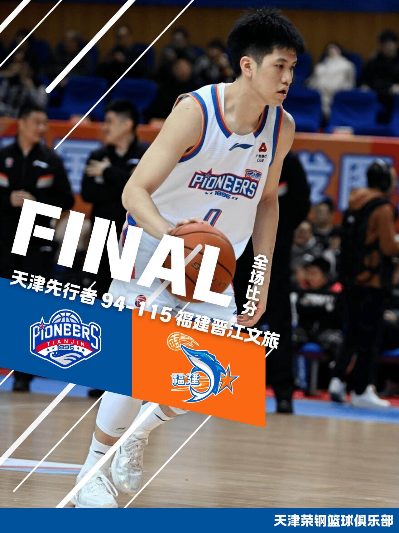 赛后据天津男篮发文,1月10日晚,2025-2026赛季CBA常规赛第13轮,天津先行者客场对阵福建晋江文旅。上半场比赛,双方进攻效率均在线,三分球命中率都达到50%,先行者在林庭谦和哈姆雷特的带动下率先取得优势,稳住节奏并持续保持领先。易边再战,先行者防守质量下降、出现连续失误,福建晋江文旅则手感持续升温,第三节攻防爆发轰下37分完成反超,并逐步拉开分差。最终,天津先行者94-115不敌福建晋江文旅。