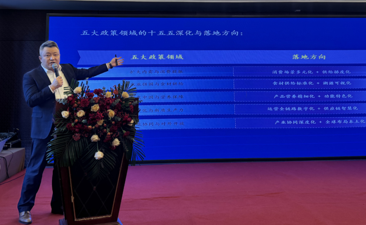 尚普咨询集团创始合伙人兼CEO邓新宇做了《“十五五”餐饮增长新基点》主题报告。他认为,“十四五”期间餐饮规模突破5万亿大关,随着“十五五”规划明确餐饮行业发展方向,政策托底与市场驱动形成双重利好,行业将迎来新一轮爆发。“十五五”核心政策基调是以国家战略为纲、激活消费与产业双循环。锚定国家核心战略、释放精准赋能红利,将带来餐饮食材行业向全链协同、价值创新、标准化、数字化、绿色化转型的深度变革,企业应当把握机遇,实现业绩持续增长。