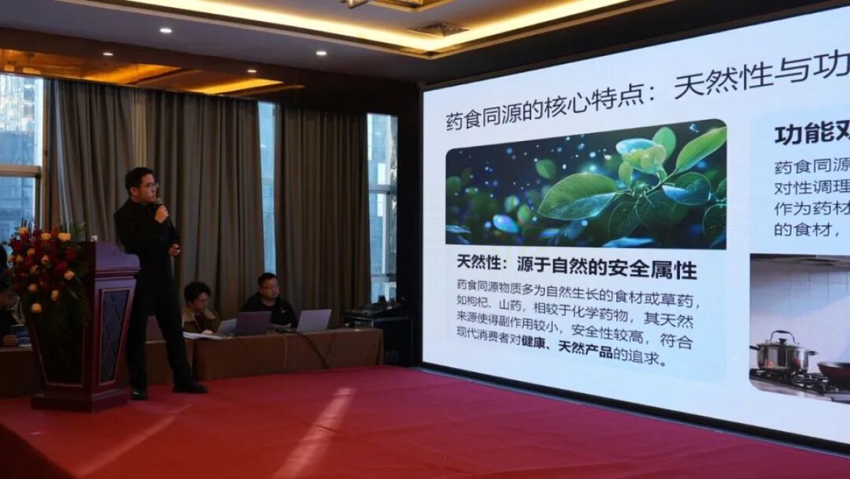 郑州轻工业大学李培峰院士团队的代表曾奇龙做了《药食同源在餐饮食材业中的应用》主题报告,介绍了药食同源的由来、发展历史和当前的发展情况。2023年药食同源食品市场规模约6000亿—8000亿元。2024年电商平台销售额达到234亿元,同比增长22.3%,展现了强劲消费潜力,消费群体也从传统以中老年为主扩展到了年轻群体。