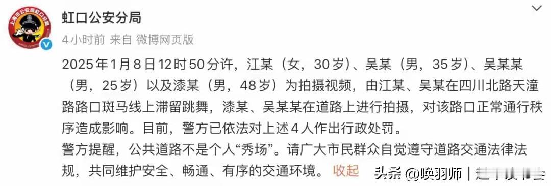 1月8日,上海四川北路一天潼路路口,江某等四人为拍摄视频,在斑马线跳舞并在车道上拍摄,扰乱交通秩序,被警方行政处罚。警方强调,公共道路非个人“秀场”。 延伸案例:此类为博眼球或占便宜而漠视规则的现象并非个例。此前,一女子因替朋友交通违法“代扣6分”被罚5000元;一“00后”女子更因在上海系统性恶意“薅羊毛”白吃白喝两个月,涉嫌寻衅滋事罪被刑拘。 专业解读:法律界限分明。斑马线跳舞扰乱秩序,属行政违法。“薅羊毛”行为若具有持续性、广泛性,严重扰乱市场秩序,则可能涉嫌寻衅滋事等刑事犯罪。 民生警示:这些行为最终损害公共秩序与市场环境,侵蚀社会信任,买单的是所有市民。它警示:网络时代的个性表达与逐利行为,绝不能挑战法律与公德的底线。斑马线跳舞 上海交通违法 上海马路拍照 上海斑马线 上海跳舞人 上海违章处理 上海斑马线跳舞 上海倒车事件 宜宾斑马线事故 长宁街拍 斑马线摆拍 上海人跳舞 上海街头表演 锦帆路街拍 斑马线赔偿谣言
