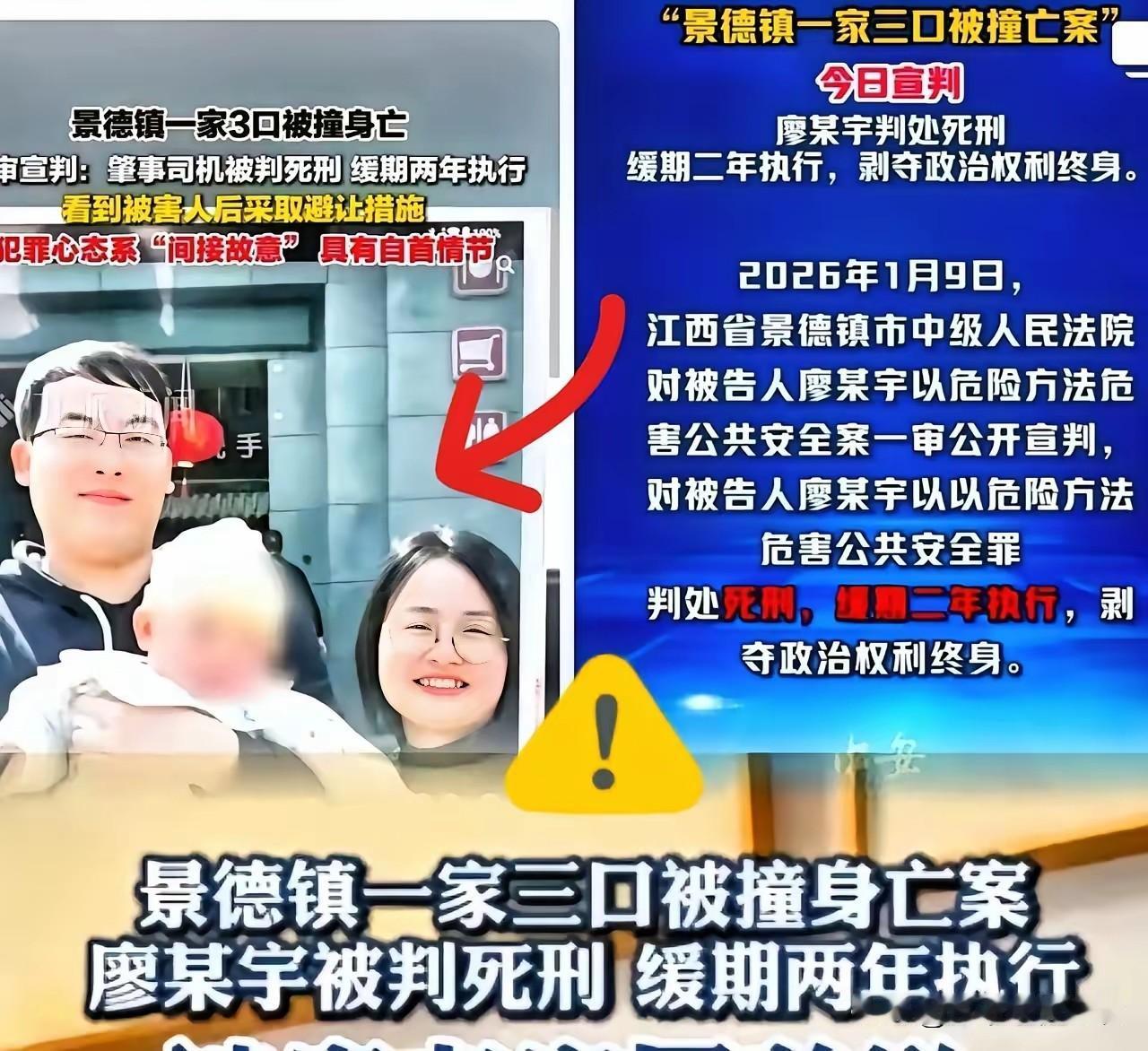 景德镇一家三口被撞案的法官 估计睡不着觉了 他万万没想到,自己翻遍律法条文,反复斟酌后判下的死缓,竟惹得众人皆不满意。 而大家为何如此愤愤不平,还得从案件细节说起。因为廖某宇高速飚车撞死三口口时,没有打120。还是路边上群众打的。 婴儿的头撞断飞入廖车副驾座,廖某宇轻蔑的说,小孩头真硬,他下车点根烟抽,一幅冷漠毫不相于的样,把人性的凶残冷酷演到极致。 按常理,撞死人家,呆在原地等警察这是最起码的,面对调查一五一十回答问题是应有的态度,你就算不承认想有所隐瞒,还有监控和目击者你也逃避不了,怎么这也算主动投案坦白从宽了。 另外法官大人说廖某宇当时有打方向盘的动作,所以认为廖某宇是间接故意。那请问问法官大人,如果廖某宇不打方向盘,被害人一家三口能被撞吗? 各位读者怎么看呢?