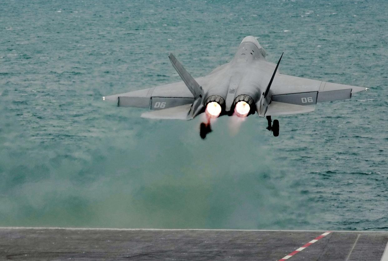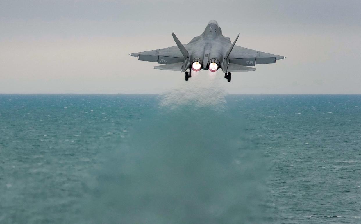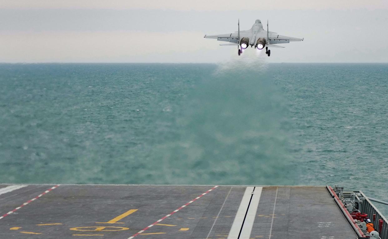 在福建舰航母上进行电磁弹射起飞和着舰训练的舰载机歼-35隐形战斗机、歼-15T重