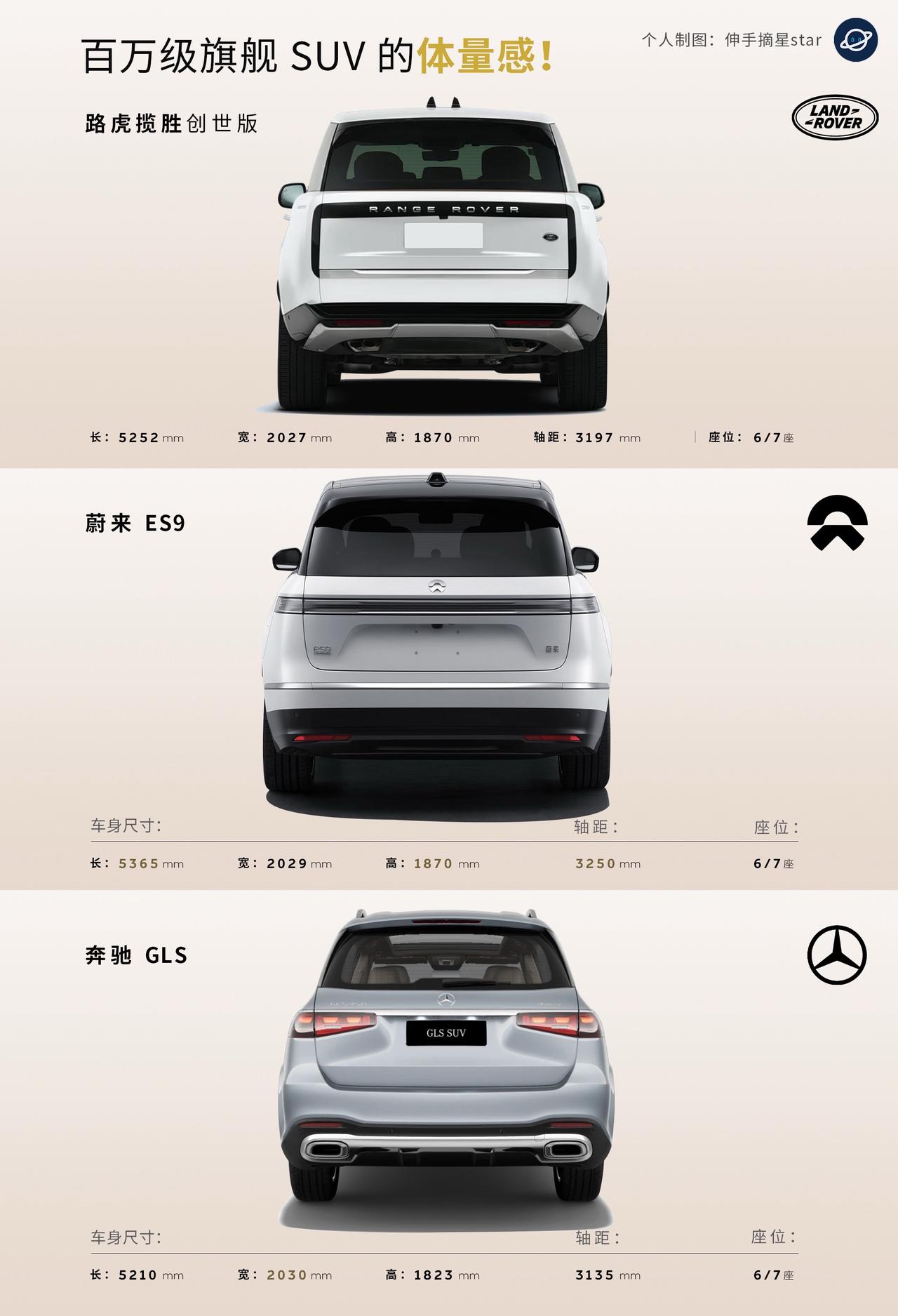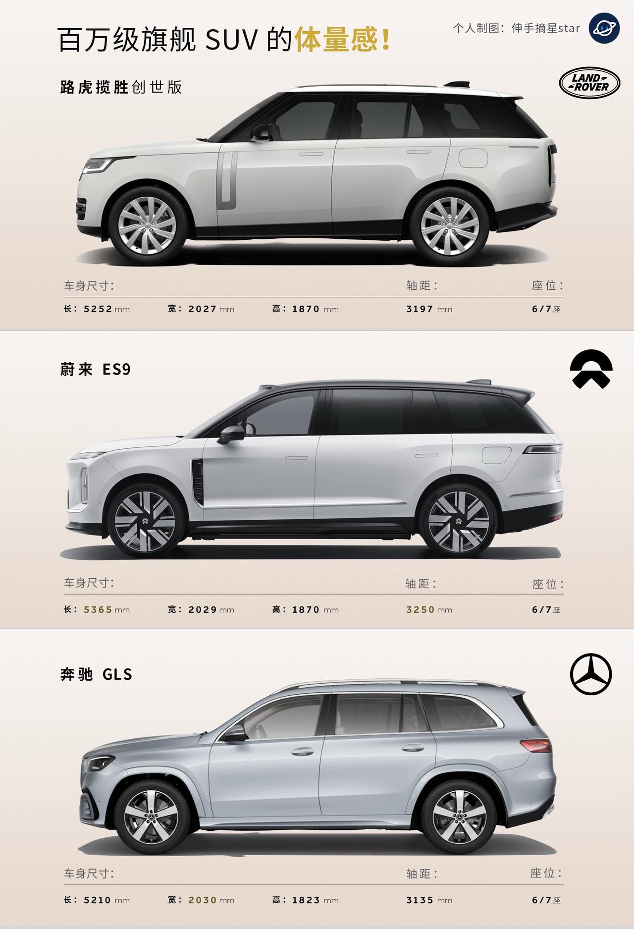 百万级旗舰SUV的体量感, ES9比大更大大大大大一号! 如果把ES9叫【纯电大揽胜】已经很不合适了, 比揽胜加长版足足大了2圈。 作为全尺寸的旗舰SUV, ES9 5365的长度很克制,也非常合适。 已经是最大尺寸的纯电SUV了。 空间也会是王者般的存在。 蔚来的车看照片看不出效果, 气势与美感不及实车的10%。 实车才是震撼,庞然巨物! ET9有的技术,ES9都有! 蔚来ES9 蔚来 路虎揽胜 新能源汽车