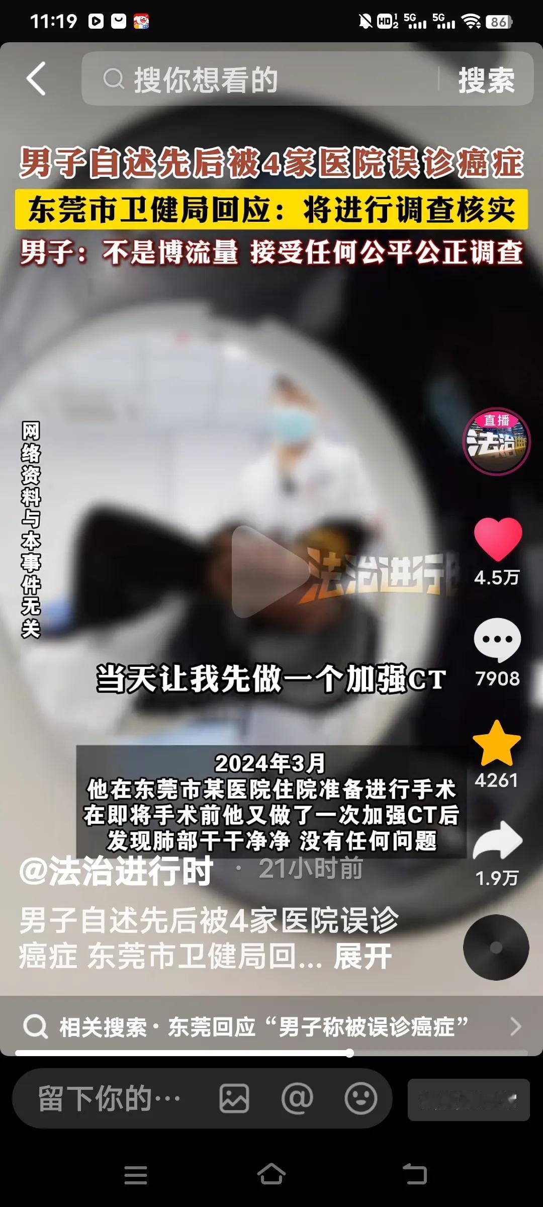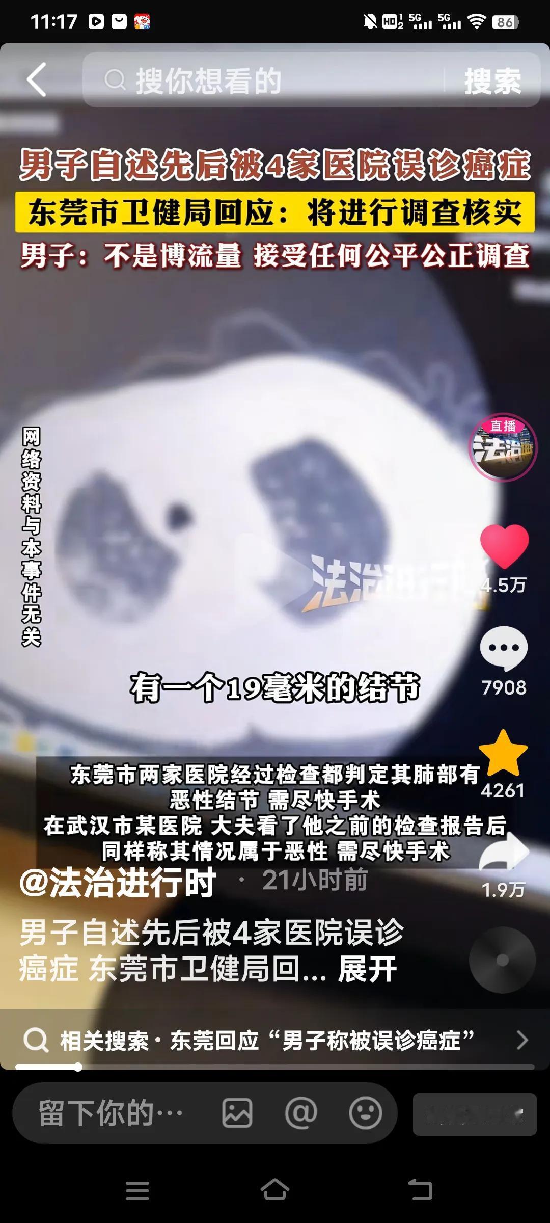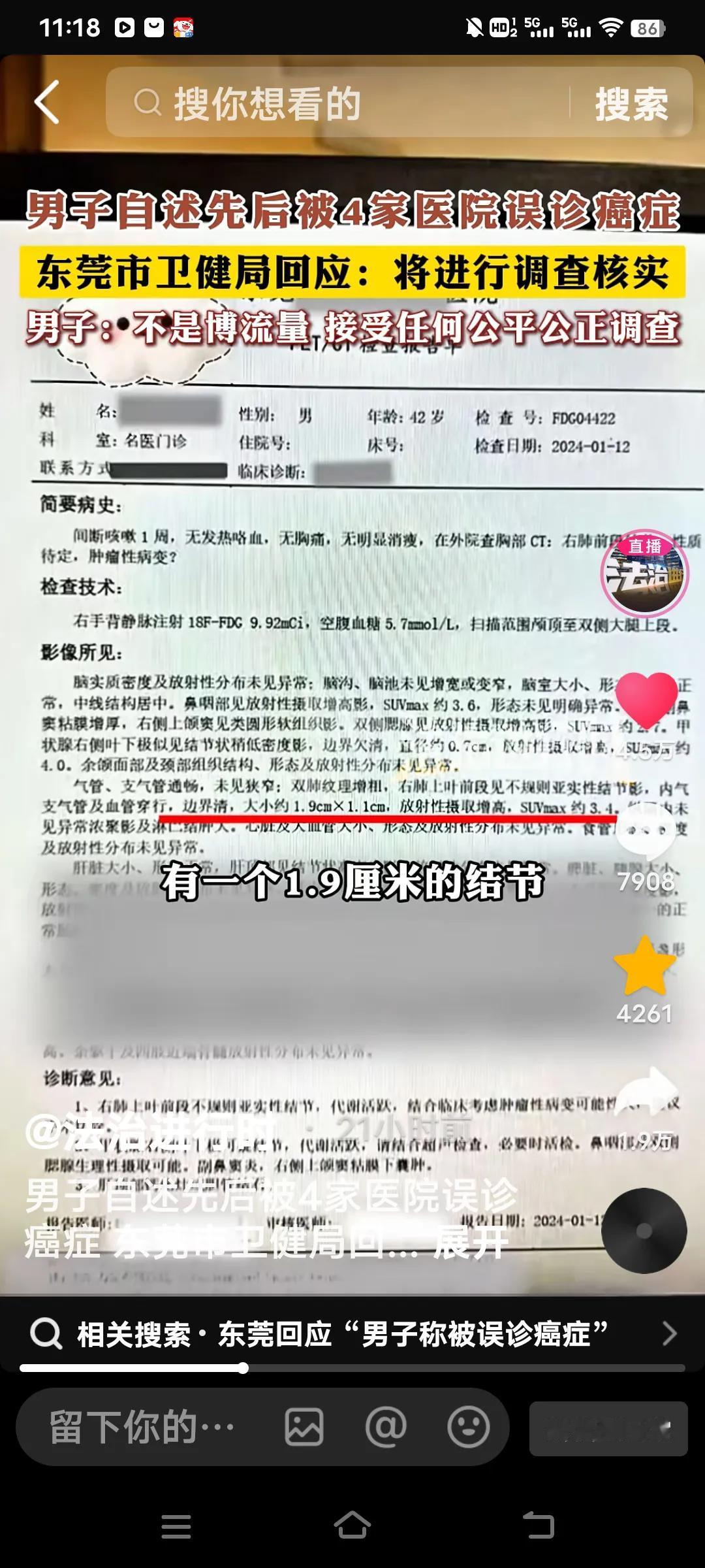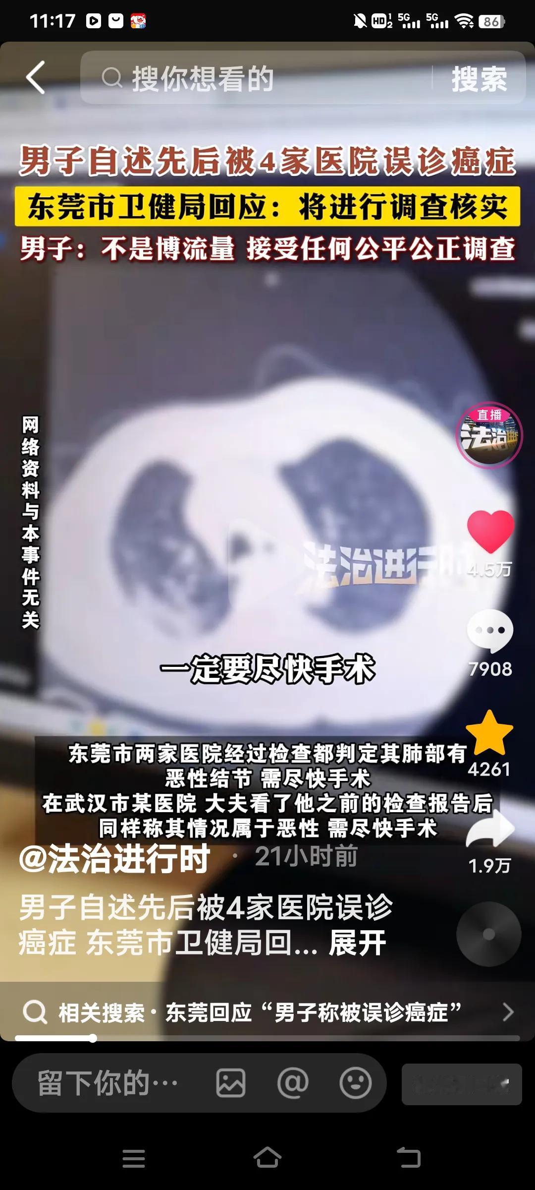 2025年12月26日,一名男子发布视频称自己被4家医院误诊为癌症,健康的肺差点被切除,此事引发网友热议。2024年1月,他因咳嗽前往医院就诊,东莞的两家医院和武汉的一家医院均判定其肺部有恶性结节,需尽快进行手术。2024年3月,他在东莞的第四家医院准备手术时,术前加强CT却显示肺部并无问题。 幸亏他多留了个心眼,要求再做一遍CT。医生询问名字时发现检查结果全是他的,一看肺部干干净净,什么问题都没有。这几家医院怎么能做出如此荒唐的事呢?实在是让人无语。这种情况很可能是第一家医院检查出问题后,后续医院就跟着判定了。 2026年1月7日,东莞卫健局表示将进行调查核实。1月8日晚,男子称自己并非为了博流量,愿意接受公平调查。也希望大家有病进医院多留些注意力吧!1月9日,卫健局工作人员称已将此事上报领导核查。这事儿简直让人瞠目结舌,若真的是误诊,对患者的身心打击该有多大。希望调查能尽快得出结果,给大家一个真相。