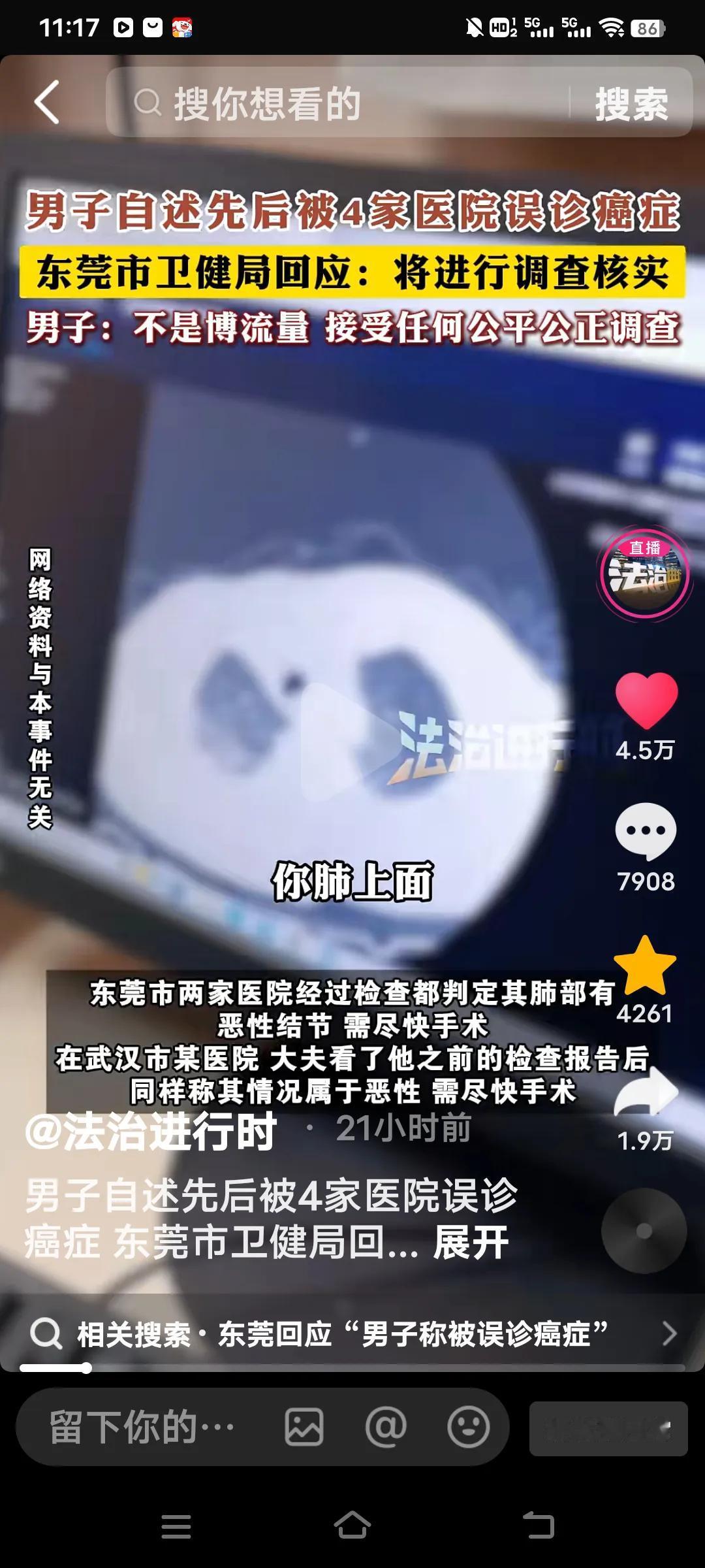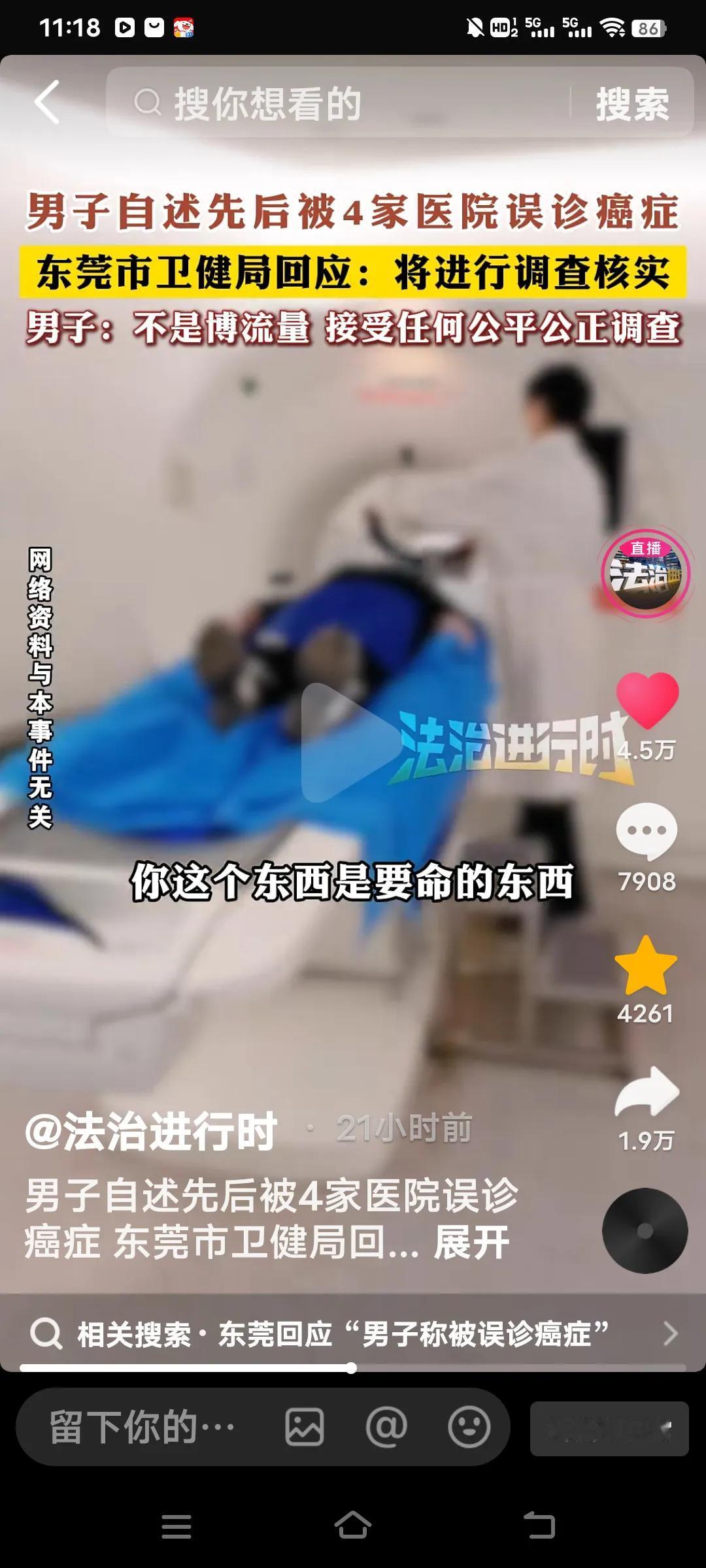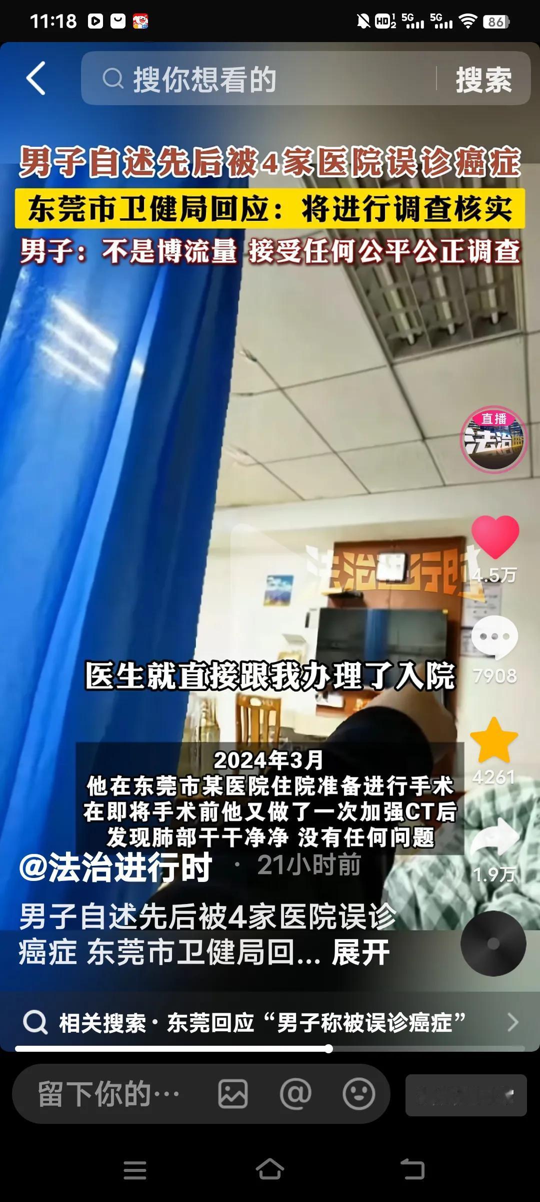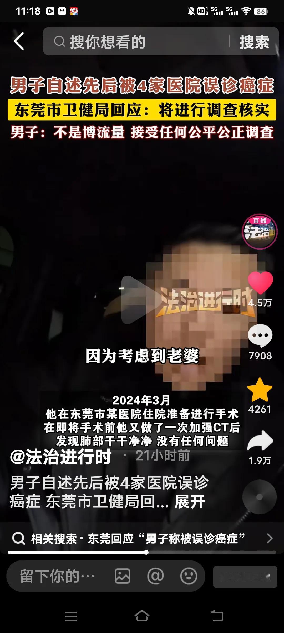 2025年12月26日,一名男子发布视频称自己被4家医院误诊为癌症,健康的肺差点被切除,此事引发网友热议。2024年1月,他因咳嗽前往医院就诊,东莞的两家医院和武汉的一家医院均判定其肺部有恶性结节,需尽快进行手术。2024年3月,他在东莞的第四家医院准备手术时,术前加强CT却显示肺部并无问题。 幸亏他多留了个心眼,要求再做一遍CT。医生询问名字时发现检查结果全是他的,一看肺部干干净净,什么问题都没有。这几家医院怎么能做出如此荒唐的事呢?实在是让人无语。这种情况很可能是第一家医院检查出问题后,后续医院就跟着判定了。 2026年1月7日,东莞卫健局表示将进行调查核实。1月8日晚,男子称自己并非为了博流量,愿意接受公平调查。也希望大家有病进医院多留些注意力吧!1月9日,卫健局工作人员称已将此事上报领导核查。这事儿简直让人瞠目结舌,若真的是误诊,对患者的身心打击该有多大。希望调查能尽快得出结果,给大家一个真相。