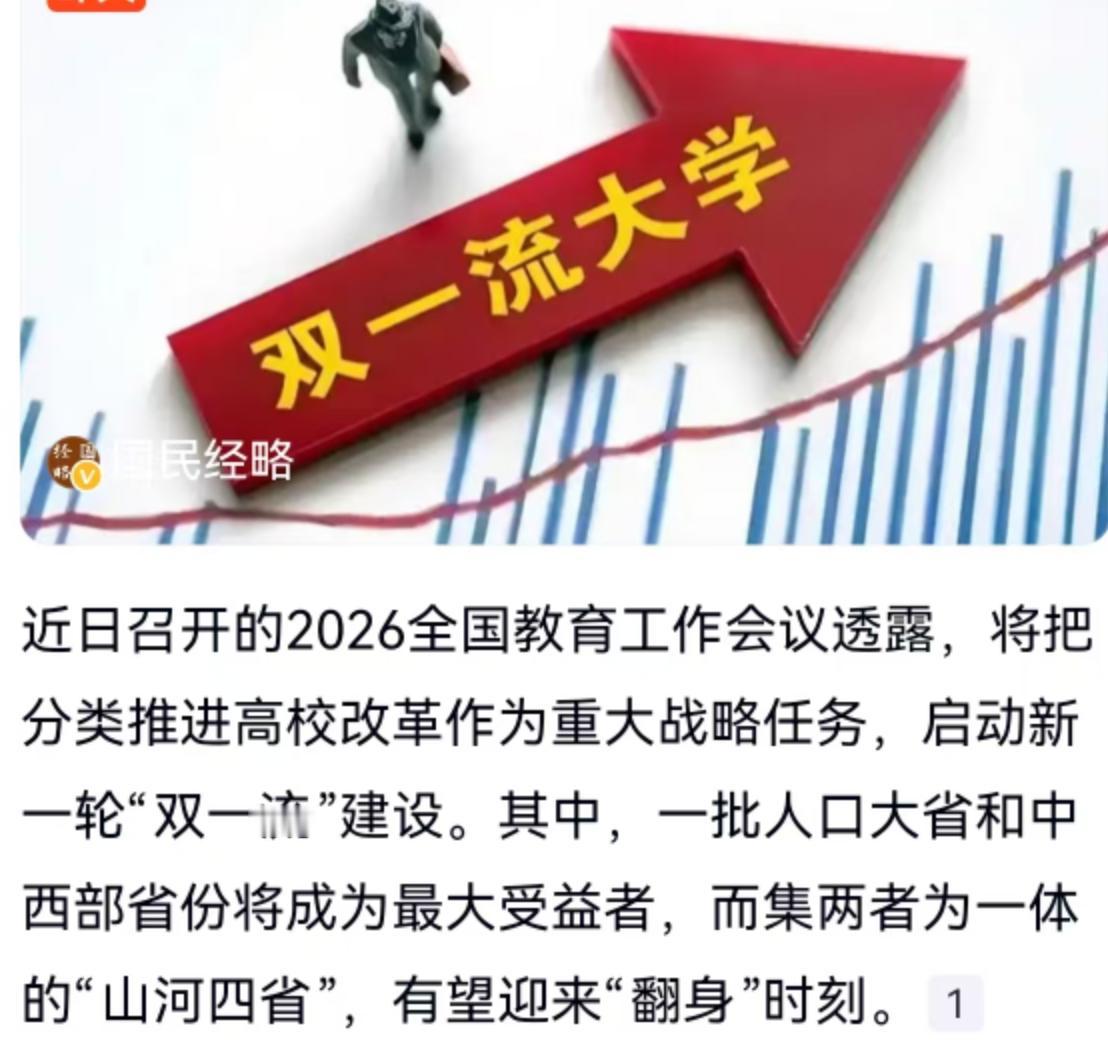 高校格局终于要迎来大洗牌了?2026年全国教育工作会议传出的消息,恐怕让不少家长和学子在这个冬天感觉到了一股暖意。会议明确释放信号,要把分类推进高校改革作为重大战略任务,并且要启动新一轮“双一流”建设。这不仅仅是一句口号,对于长期处于高等教育“洼地”的人口大省和中西部省份来说,这极有可能是一次千载难逢的“翻身”良机。 说到这儿,相信很多人脑海里第一时间浮现的就是那个常常被网友们调侃的“山河四省”——山西、河北、山东、河南。这四个地方,光是听名字就透着一股厚重的历史感,可一提起大学,当地的学生和家长们恐怕就有满腹的苦水要倒。 咱们先来看一组扎心的数据。根据教育部公布的名单,首轮“双一流”建设高校共计137所,建设学科多达465个。这些优质的教育资源,在过去很长一段时间里,分布得并不那么均匀。拿“山河四省”来说,这四个省份承载了庞大的人口基数,高考竞争激烈程度堪称“地狱模式”,但手握的“好牌”却少得可怜。河北全省境内甚至长期没有一所名义上的985大学,河南这样的高考大省,优质高等教育资源也是捉襟见肘。这种反差,直接导致了大量人才外流,学生想上个好大学,往往得背井离乡。 这次教育工作会议提出的“分类推进”,显然不是搞“大水漫灌”,而是精准滴灌。既然提到了“人口大省”和“中西部省份”将是最大受益者,那么像河南、河北这样的人口净流出大省,以及山西这样的中西部省份,在新一轮的资源分配中,理应得到更多的倾斜。这不仅是教育公平的体现,更是区域经济发展的刚需。毕竟,人才是第一资源,没有好的大学留住人才,产业升级也就无从谈起。 这事儿在网上也是炸开了锅,大家讨论得热火朝天。有来自浙江的网友感同身受,直言浙江也没多少好学校,要是能多几所像样的大学,孩子们就不用非得出省去求学。还有广东的网友调侃河北人想把河北科技大学搬回河北,虽然是句玩笑话,却也道出了河北高等教育地理分布上的尴尬——像河北工业大学这样的省属211,校址竟然还在天津。更有北京的网友一针见血地指出,按人口密度计算,河北是最缺高校的,不光缺985和211,连本科学校的数量都少得可怜。 这些来自天南海北的评论,其实都指向了同一个痛点:人民群众对优质高等教育资源的渴望,与当前资源分布不均之间的矛盾。 回溯历史,从“211工程”到“985工程”,再到2017年正式启动的“双一流”建设,国家对于高等教育的投入从未停止,而且标准越来越科学,也越来越注重实绩。2017年1月,经国务院批准,教育部、财政部、发改委印发了《统筹推进世界一流大学和一流学科建设实施办法(暂行)》,同年9月,首批名单公布,标志着中国高等教育进入了新的阶段。如今,站在2026年的节点上展望新一轮建设,这绝不是简单的数量扩张,而是对高等教育结构的一次深度优化。 对于即将面临高考的家庭,或者正在规划孩子未来的家长来说,这无疑是一个值得密切关注的信号。随着改革力度的加大,那些曾经因为地域限制而被忽视的省份,很有可能会涌现出一批“黑马”高校。无论是学校的硬件设施,还是学科建设的软实力,都有望迎来质的飞跃。 当然,罗马不是一天建成的,高校改革和建设更是一个漫长的过程。政策的春风已经吹起,但对于高校而言,如何利用好这波红利,潜心治学,提升科研水平和教学质量,真正拿出世界一流的成绩单,才是硬道理。而对于我们普通大众来说,不妨多一点耐心,多一点期待。或许在不久的将来,咱们家门口就能有一所拿得出手、叫得响的世界一流大学,让孩子们在家门口就能接受顶尖的教育,不再是遥不可及的梦想。 以上内容仅供参考和借鉴
