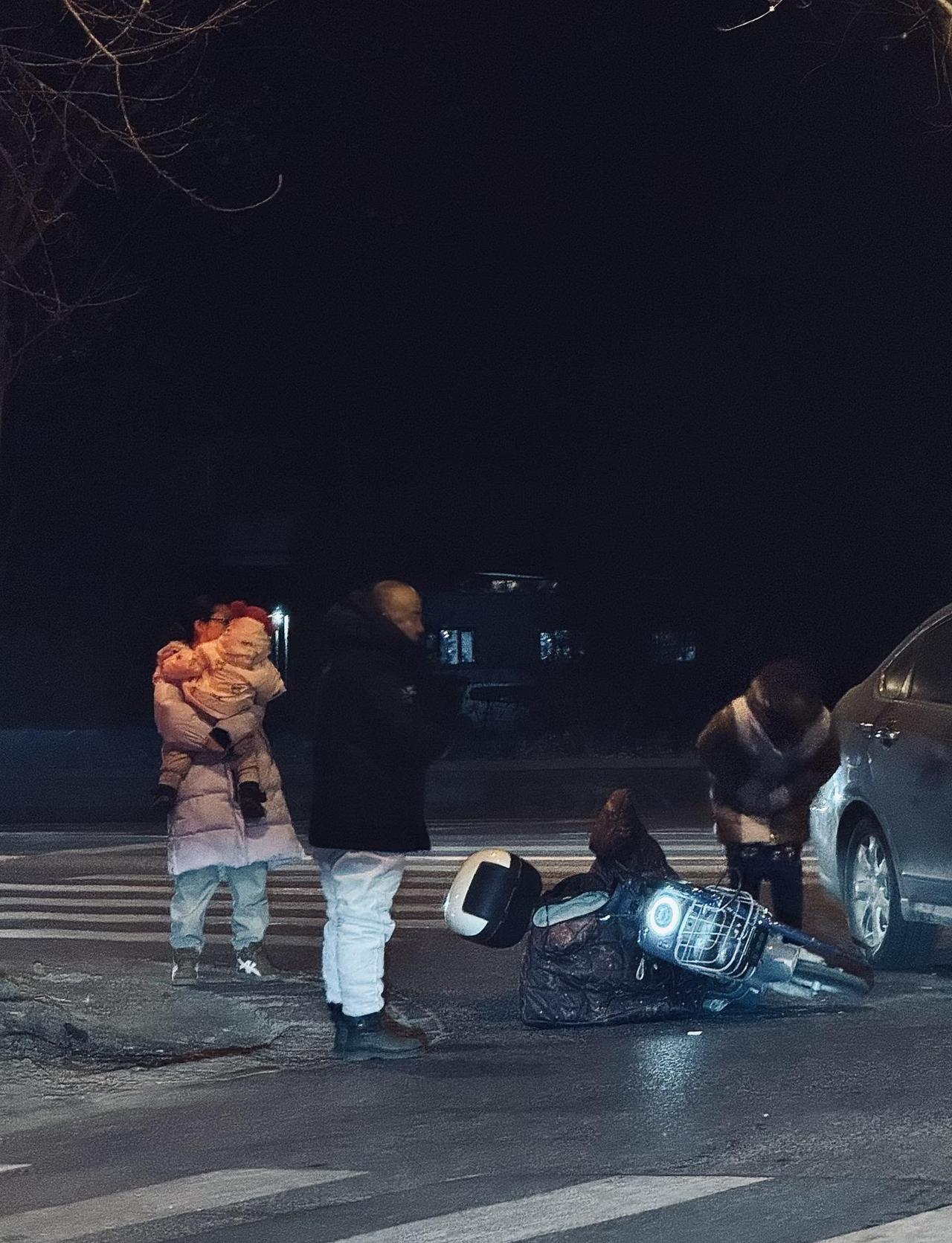 寒夜事故中的责任与温情 街头的一声巨响打破了冬夜的宁静。在某十字路口,一辆轿车与电动车发生剧烈碰撞,碎片与倒地的车辆瞬间定格了这起突发的交通事故。 现场的氛围紧张而凝重。昏黄的路灯将寒夜的凛冽无限放大,空气中弥漫着事故发生后的惊魂未定。 在这起意外的漩涡中心,轿车车主及其随行人员的表现成为了画面的焦点。面对突如其来的变故,他们没有丝毫迟疑或逃避。车主第一时间跪地俯身,确认车辆的损坏程度;同行的女子焦急地拨打急救电话,试图在慌乱中寻求专业援助;另一位怀抱幼童的女士则在旁协助,在确保孩子安全的同时,用行动维护着现场的秩序。 这组影像记录的不仅仅是一次车祸,更是一场关于“担当”的人性速写。在可能面临巨大责任压力的危机时刻,这一家人展现出的不是惊慌失措,而是直面后果的勇气与对生命的敬畏。他们用最朴素的行动,在冰冷的事故现场筑起了一道温暖的防线,诠释了责任二字在危急关头的重量。 影像激励计划 温暖与感动 冬天的夜晚 深夜的街道