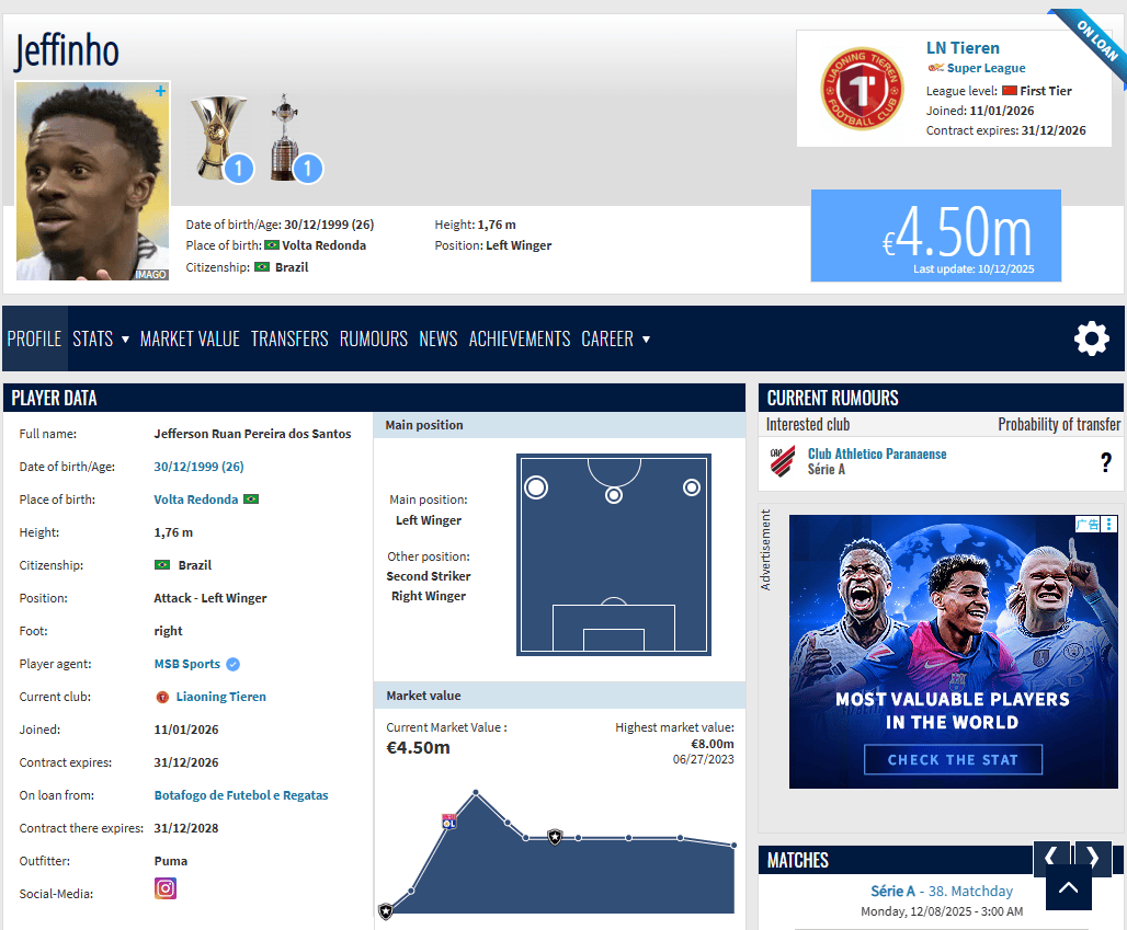现年26岁的热菲尼奥目前身价450万欧元,是中超联赛的第一身价。而在热菲尼奥效力里昂时期,他的身价曾达到过800万欧元。