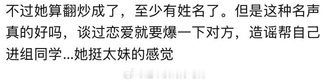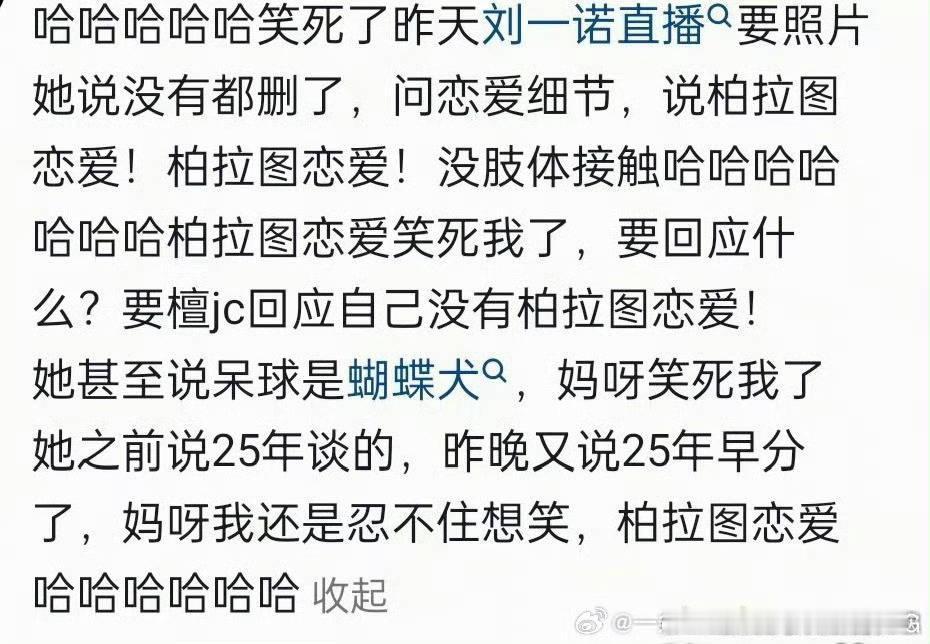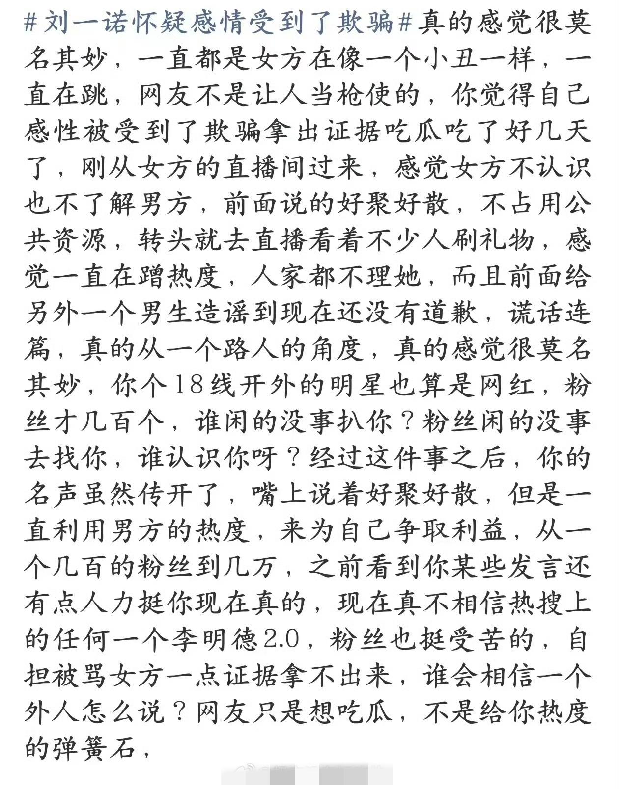 刘一诺直播回应和檀健次的恋情,看完她直播,给人感觉,心智完全不太成熟诶!把网友当枪使的感觉,直播下来给人感觉前言不搭后语,不知道她到底想表达什么?还说看不懂的人是认知太低了!这完全不像网友口中的小白花呀?有点像《猎罪图鉴2》里的阮芳芳! 比如她的话语前后矛盾不一致,说自己很尊重女性,又随意评判了蛮多女性,比如说很多韩娱女艺人,一边爆料说确实谈恋爱了又说自己是柏拉图,有人会怀疑她说话的真实性也蛮正常…… 爆出柏拉图恋爱,爆出檀小呆是蝴蝶犬吗?原本以为从从容容游刃有余,实际却是匆匆忙忙连滚带爬!蹭完流量开始准备直播带货了吧,网红惯用伎俩! 这个女的直播说谈了,但是是柏拉图式恋爱,俩人没有肢体接触。不认识檀健次养的俩小狗是什么狗,俩人没有聊天记录,合照删了!问他咋谈上的,她说配得感要高。所以,这是谈的啥恋爱? 柏-柏-柏拉图!搞了半天是精神恋爱!那我也是柏拉图啊!全体小炭火都是柏拉图呀,可以问问檀健次,我们是不是柏拉图? 莫不是檀健次路过的时候看了她一眼,她就觉得恋爱了?早上说不想再提及檀健次了,晚上就开直播,这就是好聚好散吗?你的“最后一次”是“最后N次”吧?又是发微博又是直播一直提! 看样子檀健次是你的人生高光无疑了,而你却是他的黑暗时刻,这波流量吃的真是乐呵呵,直播间里前言不搭后语的,放过他也放过你自己吧!不要再打扰当事人了,这件事能不能到此为止了! 各位路人有时间听假瓜,不如来看《震耳欲聋》不会让你失望的!