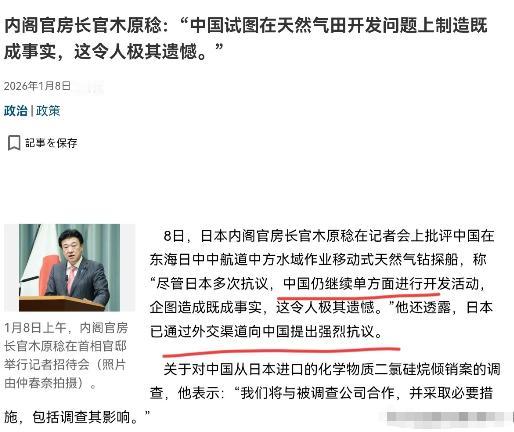 日本再次出来表态!1月8日,日本内阁官房长官木原稔在记者会上称,中国在东海日中“中航道”,中方水域作业移动式天然气钻探船一事,尽管日本多次抗议,中国仍继续“单方面”进行开发活动,“企图”造成既成事实,这令人极其遗憾。日本已通过外交渠道向中国提出强烈抗议。 这已不是日本方面第一次就类似问题跳出来指责,每一次中方在自己的海域进行合法合理的开发,日方总要渲染一番所谓的“单方面”和“既成事实”。 咱们得先搞清楚那个所谓的“日中中间线”到底是个什么玩意儿。东海海域宽度不够宽,中日双方海岸线相距不足400海里,这就产生了海域划界的问题。 中国在这个问题上的立场一直非常明确且坚定,那就是东海大陆架自然延伸到冲绳海槽,这也就意味着中国拥有开发该区域油气资源的合法权利。 日本方面自己划了一条所谓的“中间线”,这条线完全是日本单方面的主张,中国政府从来就没有承认过,更谈不上接受。 既然中国不承认这条线,那么中国在自己认为是大陆架范围内的水域进行油气钻探,就是百分之百的主权行为。 日本动不动就拿这条他们自己心里认定的线说事儿,指责中国“单方面”开发,这在逻辑上根本站不住脚。中国在自己的地盘上干活,不需要看任何国家的脸色,更不需要经过谁的批准。 木原稔提到的“移动式天然气钻探船”,其实指的是中国在东海进行的正常油气资源勘探开发。这种活动关乎中国的能源安全,是国家发展的必要举措。 日本方面对此反应如此激烈,甚至还上升到“极其遗憾”的高度,说白了就是心虚加焦虑。他们心里很清楚,随着中国在东海常态化存在的加强,他们试图通过长期实际控制来蚕食中国海域权益的算盘正在落空。 日本此次宣称已通过外交渠道提出“强烈抗议”,这几乎是日本外交在面对中国时的标准套路。不管有理没理,先抗议一下,刷一下存在感,给国内右翼势力一个交代,同时也试图在国际舆论上把自己装扮成受害者。这种做法除了暴露日本在海洋权益问题上的霸道和无理之外,没有任何实际效果。 中国外交部此前多次明确指出,中方在东海的活动完全合法正当,日方无权说三道四。这次日本旧调重弹,依然改变不了中方在东海权益问题上的法理优势。 东海的局势之所以时紧时松,很大程度上就是因为日本这种不切实际的野心在作祟。他们不仅不尊重中国的主权主张,反而还试图把中国正常的资源开发污名化。 从更深层次来看,日本在东海问题上的每一次挑衅,背后往往都有复杂的战略考量。他们试图通过制造海上争端,来牵制中国的海洋发展战略,同时以此来拉拢域外势力介入东海局势。这种借力打力的策略,日本政客们玩得很溜,但现实是,中国维护国家主权和海洋权益的决心和能力都在不断增强,日本的小动作注定无法撼动大局。 木原稔作为内阁官房长官,代表官方发表这种不负责任的言论,无疑会给本就脆弱的中日关系增添新的不确定性。就在中日双方都需要管控分歧、寻求合作的时候,日本再次选择在敏感问题上激化矛盾,这显然不是一个负责任邻国应有的态度。 咱们回过头来再看这个“既成事实”。日本最怕的就是中国把东海的开发搞成了常态,把力量实实在在投射过去。 一旦中国在东海的油气开发形成了规模,相关的基础设施不断完善,那么日本所谓的“中间线”主张就会彻底沦为一张废纸。所以他们现在的焦虑,恰恰是因为他们看到了中国正在一步步把事情做成,而他们只能站在岸边干瞪眼。 中国在东海的维权执法和资源开发是相辅相成的。执法力量保障了作业的安全,作业的实际开展又宣示了主权的存在。这种良性循环让中国在东海的主动权越来越大。日本方面如果真的希望东海保持和平稳定,就应该停止这种无谓的抗议和指责,回到尊重事实、尊重法理的正确轨道上来。 国际社会看得很清楚,谁是东海局势的破坏者,谁是和平稳定的维护者。日本频繁炒作中国威胁论,制造紧张氛围,这种做法在地区国家当中越来越不得人心。中国一直主张通过对话协商解决海洋权益争端,但对话的前提是相互尊重,而不是一方无休止的挑衅。 这次事件再次提醒我们,海洋权益的斗争是长期且复杂的。日本不会因为一次抗议失败就善罢甘休,未来肯定还会找各种茬。我们对此必须保持清醒的认识,坚定不移地推进在东海的各项开发活动,用实际行动来捍卫每一寸海洋国土。 日本所谓的“遗憾”,在中国维护国家主权的坚定决心面前,显得一文不值。中国该干什么还是干什么,钻探船该在哪里作业就在哪里作业。这种定力,恰恰是中国作为一个海洋大国所必须具备的素质。任何外部势力的干扰和阻挠,都无法阻挡中国走向深蓝的步伐。