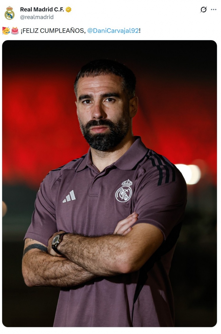 皇马官方社媒晒出卡瓦哈尔的照片,配文:“生日快乐,卡瓦哈尔!”