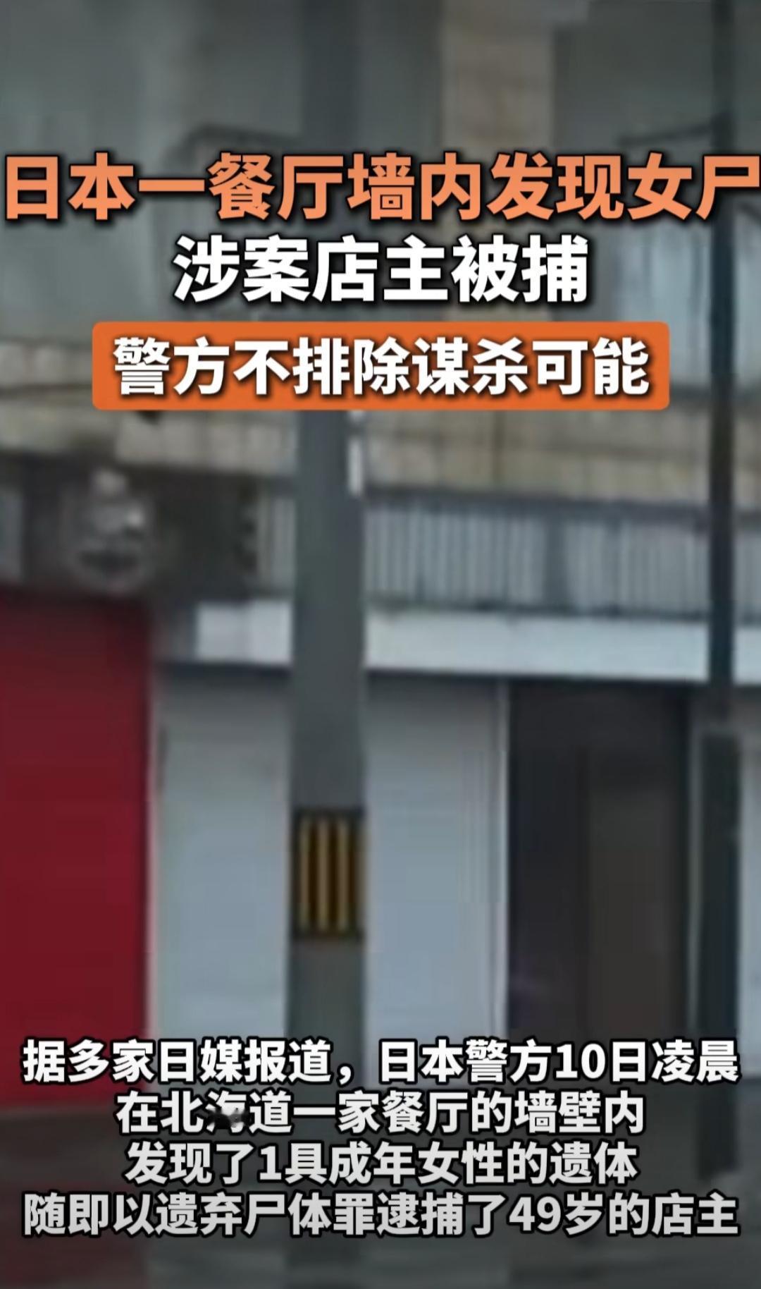 最近日本北海道发生了一件让人毛骨悚然的事,一家餐厅的墙壁里居然藏着一具女尸,这事很快就在当地引发了轩然大波。事情的起因是一位老奶奶找不到自己20多岁的孙女,实在没办法就报了警。据说这位年轻姑娘打从某天傍晚之后就没了消息,电话打不通,消息也不回,家人急得团团转,只能求助警方帮忙寻找。 警方接到报案后,就开始排查姑娘失踪前接触过的人,这一查就查到了这家餐厅的店主身上。没想到面对警察的询问,这位49岁的店主没藏多久就承认了,说尸体是他藏起来的。警方立马跟着他去了餐厅搜查,最后在餐厅二楼的墙壁内侧缝隙里找到了遗体。那个藏尸的空间大概就一张榻榻米那么大,入口还特意用木板封了起来,看起来是早就准备好的藏身之处,要是没人主动交代,谁也想不到墙壁里居然藏着这么大的秘密。 更让人觉得后怕的是,藏尸的时间刚好是大家跨年庆祝的时候,当时餐厅正是营业的高峰期,来来往往的食客那么多,谁也不知道和自己一墙之隔的地方竟然藏着一具尸体。现在警方已经以遗弃尸体罪把店主逮捕了,根据日本的法律,这个罪名最高能判三年以下有期徒刑,但目前这起案件远没这么简单。 警方现在正在赶紧做身份辨认,通过DNA比对确认遗体是不是那位失踪的年轻姑娘。而且办案人员已经明确表示,这案子不会只按遗弃尸体罪处理,他们正朝着谋杀的方向展开深入调查。大家都在猜测,店主和这位姑娘之间到底是什么关系,为什么会做出是什么关系,为什么会做出这么极端的事,是早就有矛盾,还是临时起意犯下的罪行。 这事儿曝光后,不少日本网友都觉得特别震惊,也特别没有安全感。餐厅本是大家吃饭聊天的地方,充满烟火气,没想到居然成了藏尸的“密室”。有人忍不住疑问,这么明显的墙体改造,周围的邻居或者餐厅的员工就没发现异常吗?还有人猜测,会不会有共犯帮忙,不然一个人怎么能悄无声息地把尸体藏进墙壁里。 目前案件还在进一步调查中,关于姑娘的具体死因、店主的作案动机,还有更多细节都还没公布。但不管怎么说,把尸体藏在餐厅墙壁里这种行为,既违背了法律,也挑战了公序良俗。大家都在等着警方尽快查明真相,给受害者家属一个交代,也让公众能了解到这起离奇案件的完整经过。日本惊悚事件