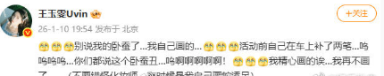 王玉雯发博解释:“卧蚕是我自己画的…你们都说丑…呜啊啊啊啊啊!我精心画的诶…我再不画了…”,并以括号备注“不要错怪化妆师,有时是我自己画蛇添足”。