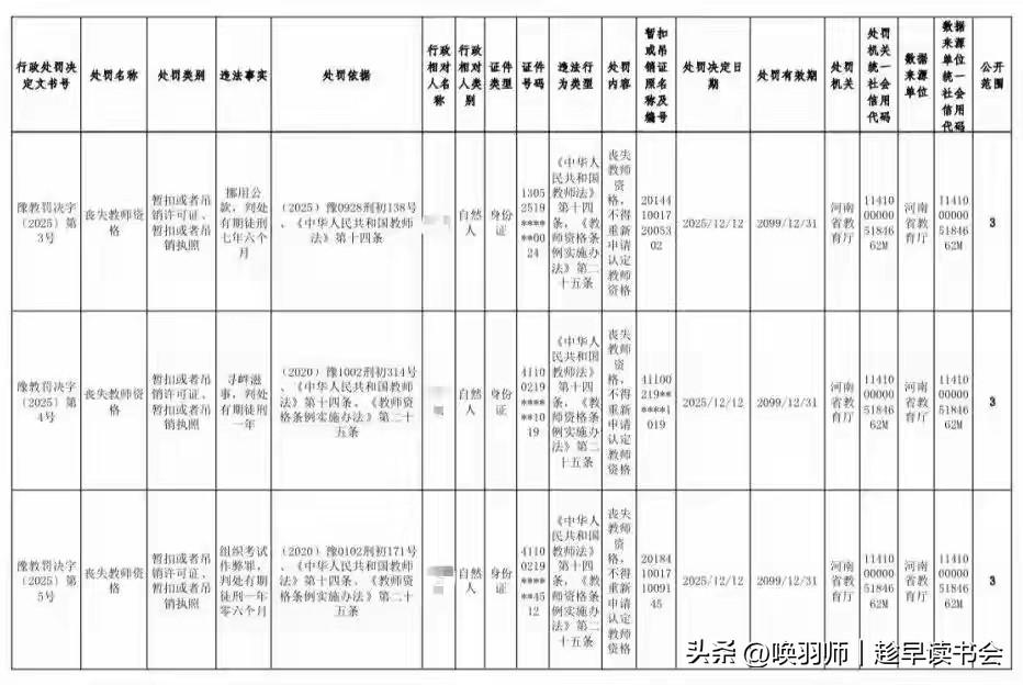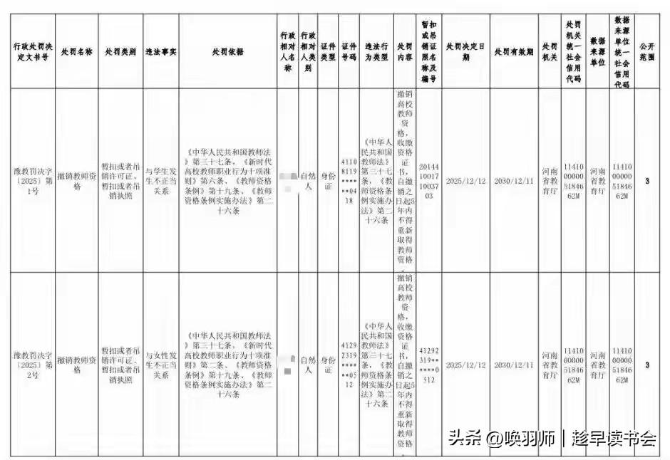 与学生有不正当关系、挪用公款等,河南五名大学教师被处罚!河南省教育厅近日集中处理五名违纪违法高校教师,引发社会对教师队伍底线问题的深度关注。处罚分两类:两人因“与学生有不正当关系”等师德问题被撤销资格;三人因挪用公款、组织考试作弊等刑事犯罪被终身剥夺资格。 这五起案件犹如多棱镜,折射出高校管理的多重“暗疮”:权力不对等下的师德沦陷、财务与考试监管的制度漏洞、以及个人法治观念的严重缺失。专家指出,问题的根源在于部分高校长期“重业务、轻师德”,监督机制形同虚设,而学生维权渠道不畅则让问题被长期掩盖。 此事与每个家庭息息相关,关乎校园环境安全、教育投资价值与社会信任基石。根本的解决之道,在于构建“不敢违、不能违、不想违”的系统防线:通过强化惩戒与曝光形成震慑,通过完善财务、招生、师生交往等制度扎紧篱笆,最终通过深入人心的法治与伦理教育,让高尚师德内化为教师的职业本能。对失格教师的清理是第一步,重塑风清气正的校园生态才是终极目标。教师违规行为 教师被处理 学生处分争议 教学事故处分 校园处分 学校开除老师 河南班主任坐牢