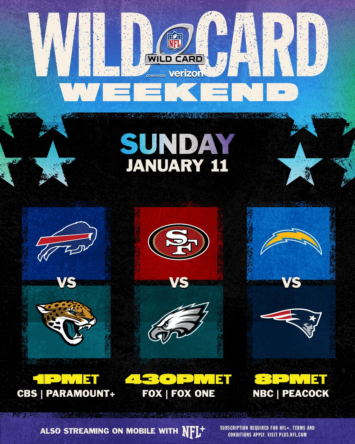 虎扑01月11日讯明日NFL季后赛外卡轮,布法罗比尔VS杰克逊维尔美洲虎(1月12日2:00开赛);旧金山49人VS费城老鹰(5:30开赛);洛杉矶闪电VS新英格兰爱国者(9:15开赛)。
