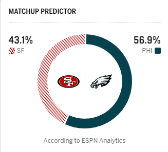 旧金山49人胜率43.1%,费城老鹰56.9%。