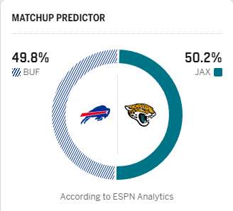 赛前,美媒ESPN预测布法罗比尔胜率49.8%,杰克逊维尔美洲虎胜率50.2%。