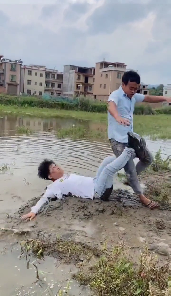 田间趣事:两位朋友在水田里欢快地玩耍搞笑