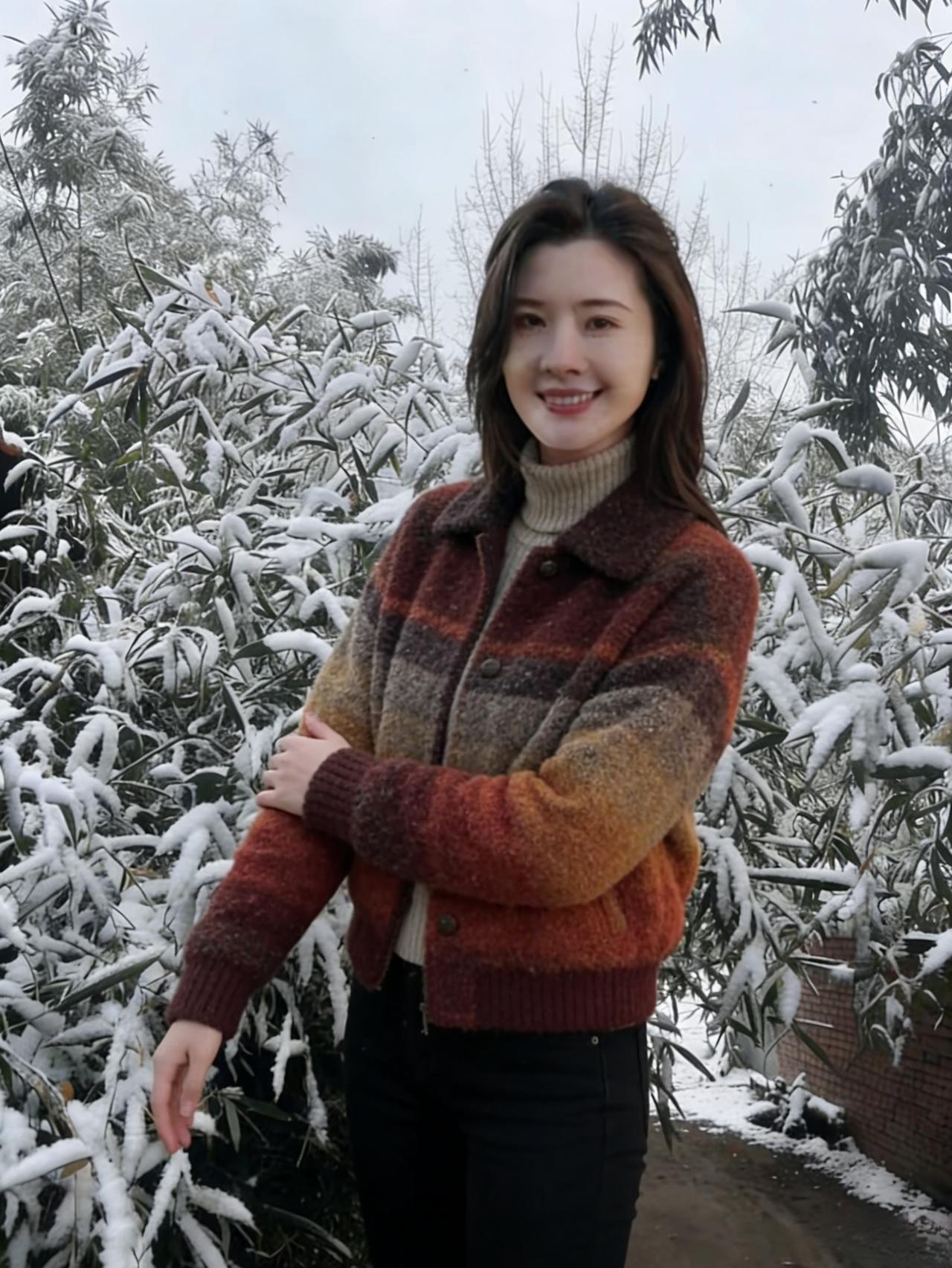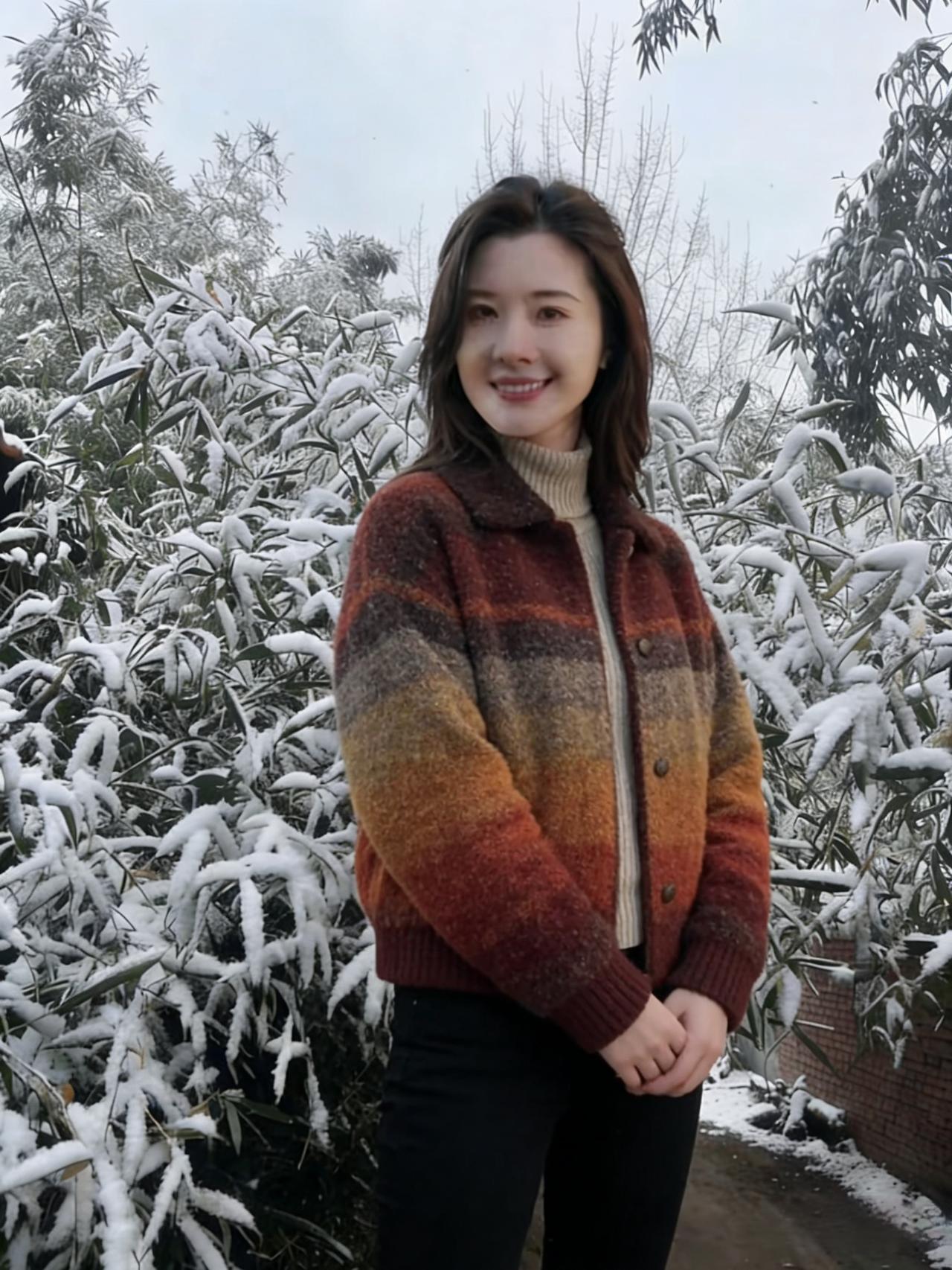 毛衣的橙红是心底的火 棕褐是沉淀的温柔 雪落在竹上,簌簌的 像时光在耳边轻语 ~ 高领裹住所有的寒 只留微笑在脸上盛开 我站在雪竹之间 与冬和解,与暖相拥