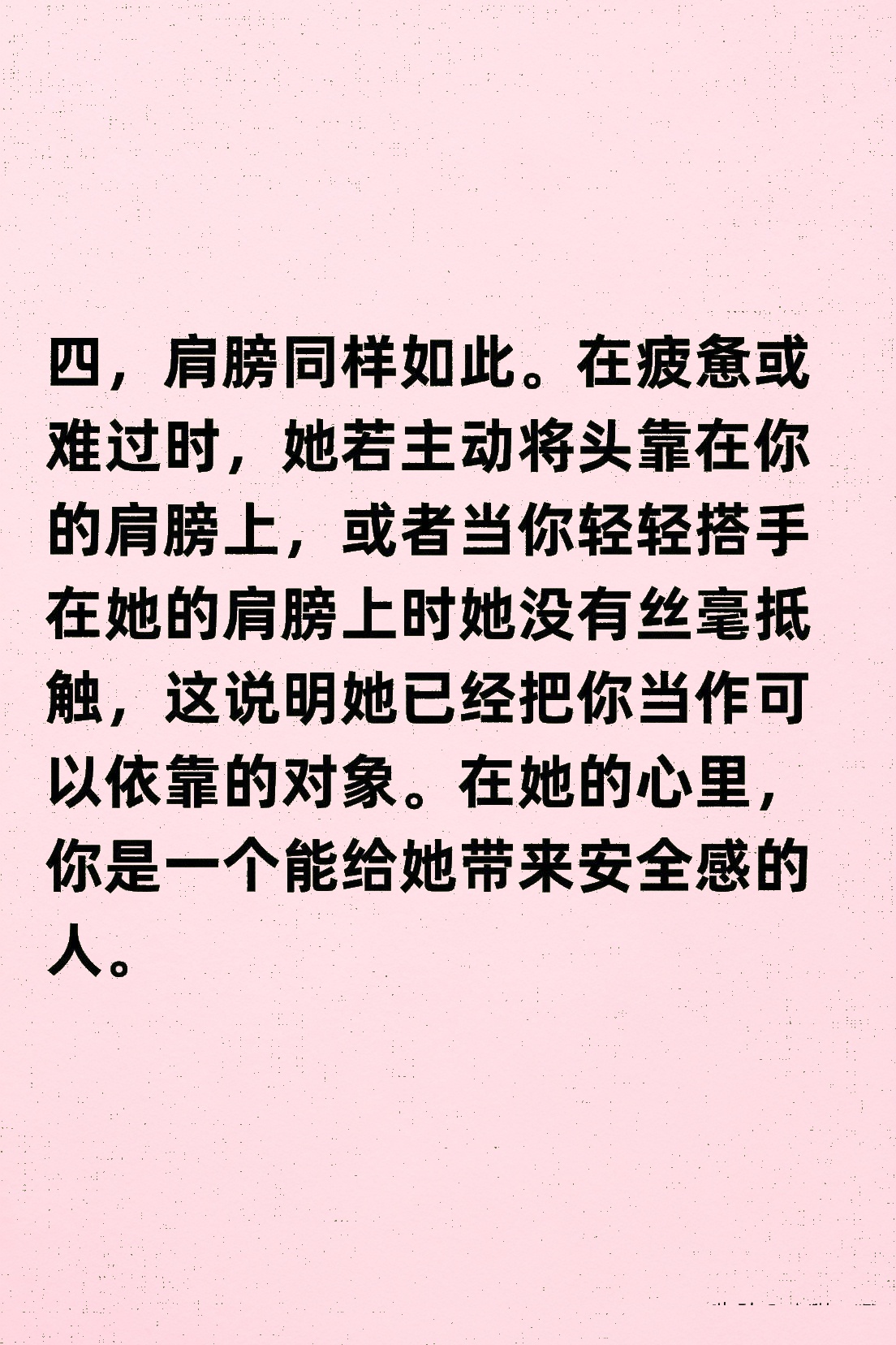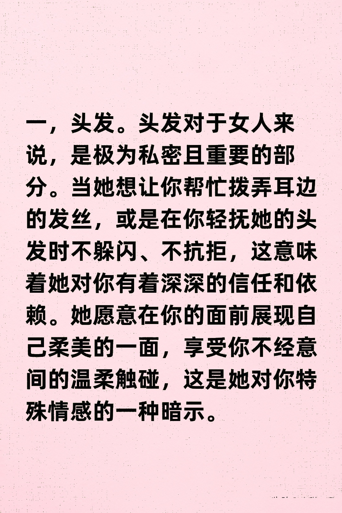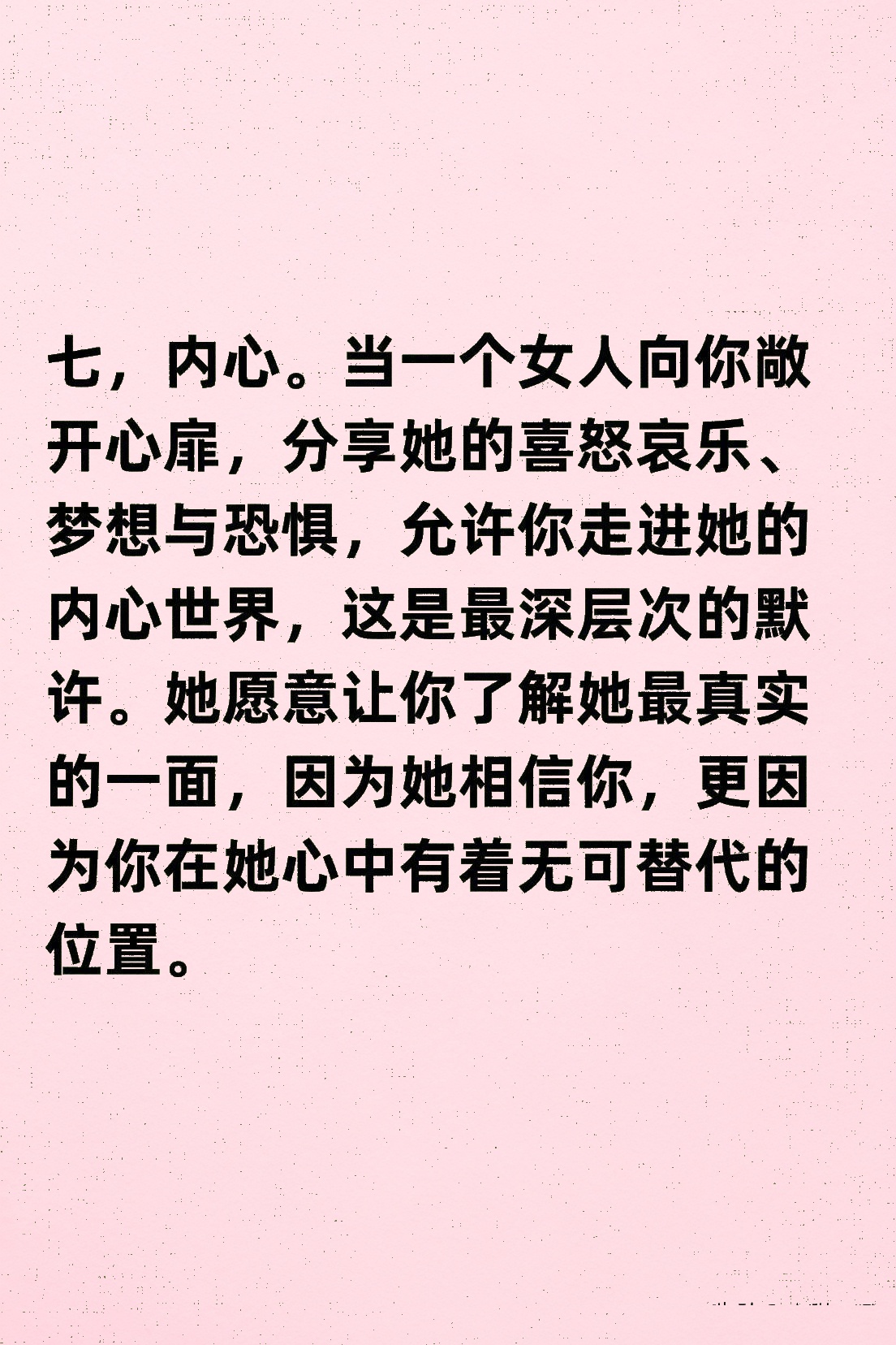 每个人的心,都有一道无形的门,守护着最柔软的角落。而她默许你触碰的,从来不只是那些具体的“地方”,更是她不轻易示人的脆弱,是她眼中闪烁的未来,是她乱糟糟的头发和没来得及收拾的心情。当一个女孩向你敞开这些“领地”,她交出的,是毫无保留的信任和依赖。这是一种超越语言的认定,是把你划进她世界的无声宣告。所以别再迟疑,这无声的邀请,是她能给予的、最深情的告白。请一定,好好珍惜这份把你当“自己人”的偏爱。