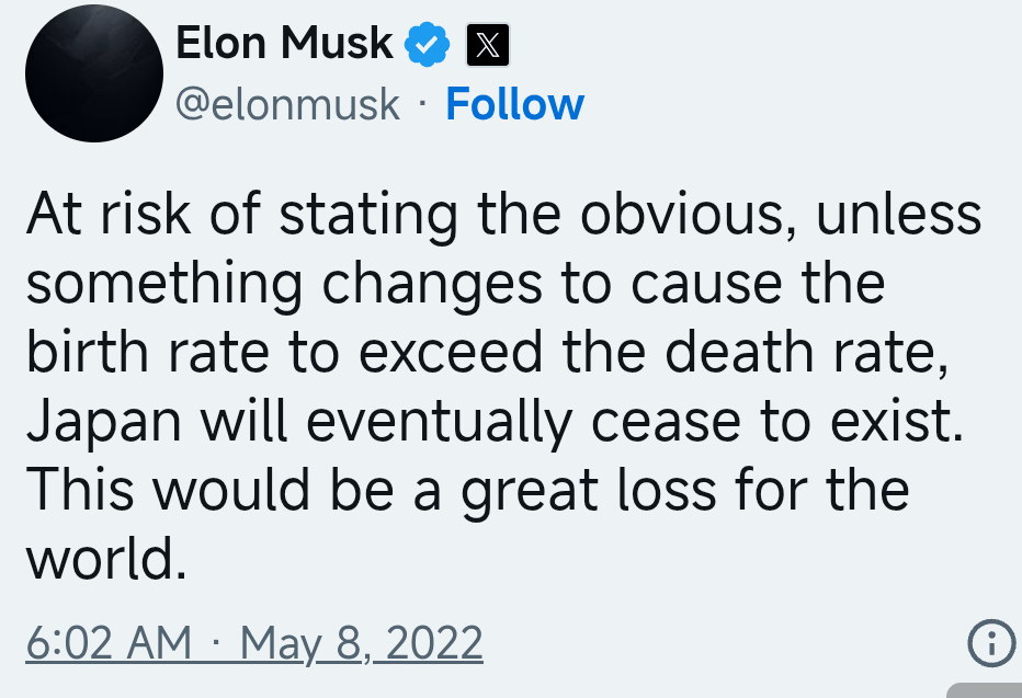 几年前,马斯克的那句“日本若不改变现状,终将走向灭亡”,很多人不屑一顾;但今天,再回头看他说的话并非危言耸听。