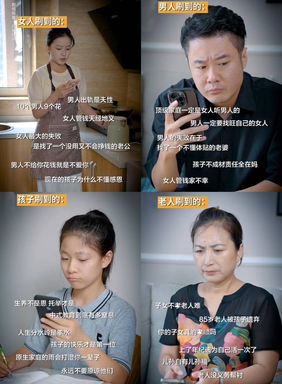 于是,男人沉溺于“无人理解”的辛酸中,女人辗转在“丧偶式育儿”的案例间,年轻人则沉浸在“断绝原生家庭”的激愤里,老人被困在“子女不孝”的剧情里……