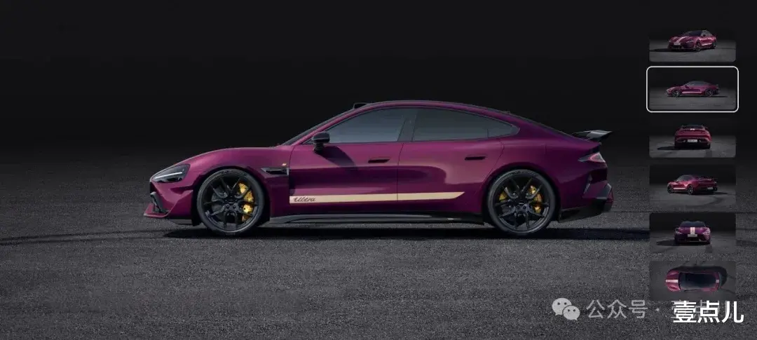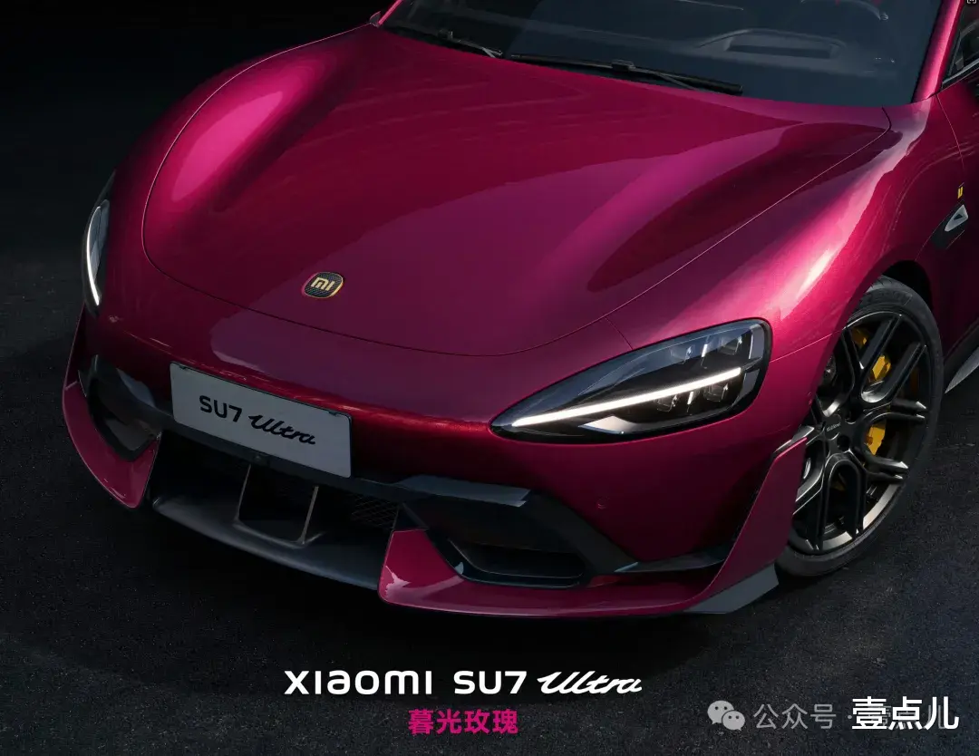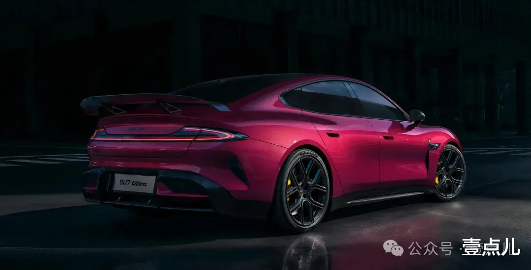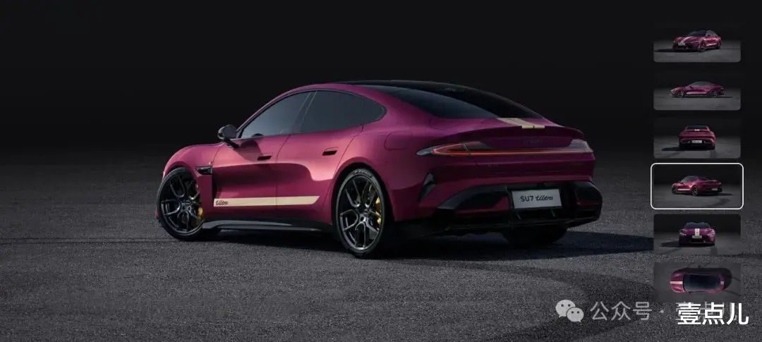 即便如此,小米官方为其新增两大选装项目:选装价11000元暮光玫瑰车漆和选装价12000元三档可调碳纤维尾翼。如果再配合选装价2000元的金色拉花,出于个人审美认知,应该是当前SU7 Ultra最拉风的外观了。