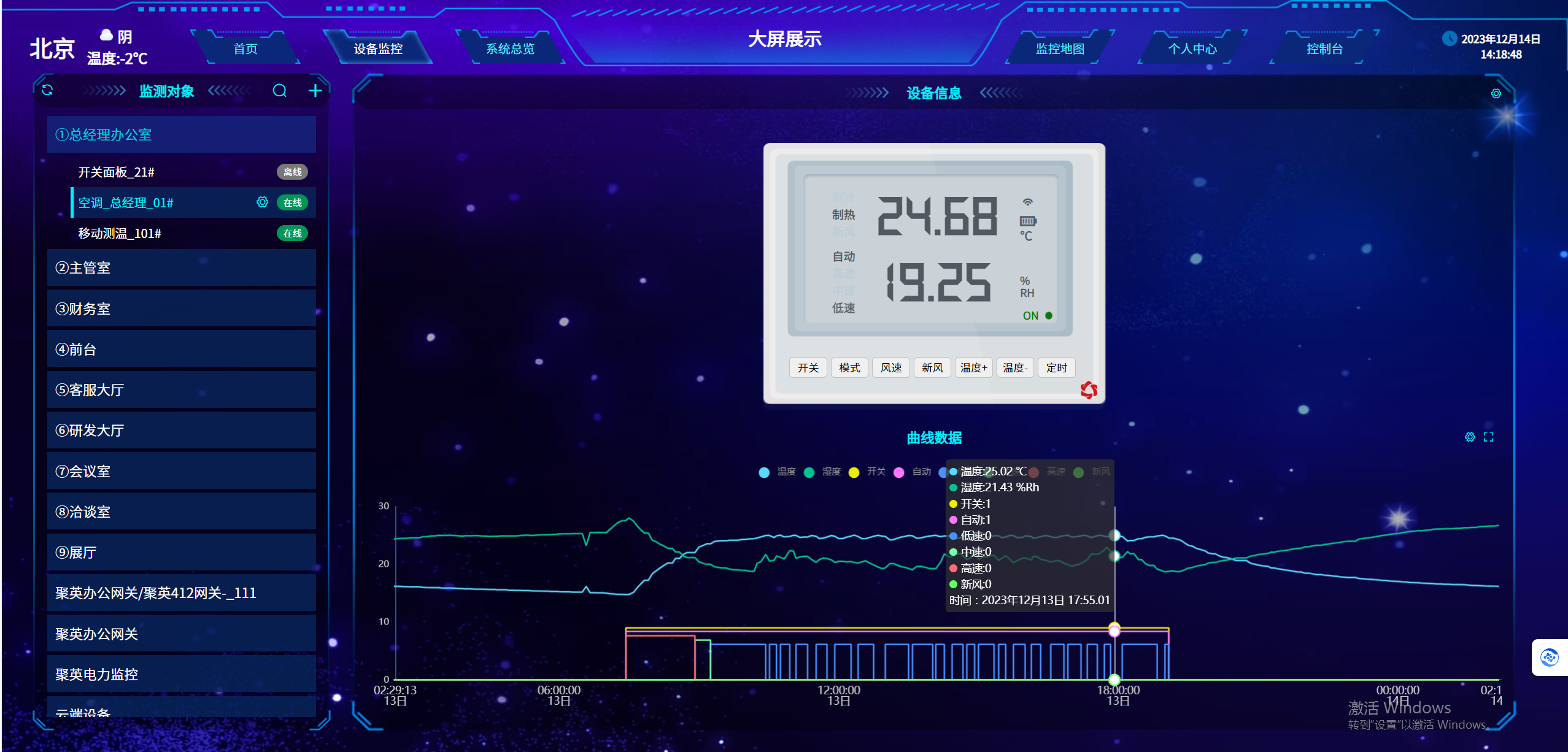 实时监控:用户通过 Web 端管理平台、移动端 APP 或微信小程序可以实时查看各区域的温度、湿度数据,以及中央空调设备的运行状态(如运行、停止、故障等)。平台以图表、数字等形式直观展示数据,如温度曲线、湿度曲线、设备运行状态指示灯等,方便用户及时了解系统运行情况。当采集到的数据超过预设阈值时,平台会自动发出报警提示,如弹出报警窗口、发送短信或推送 APP 通知等,提醒用户及时处理。