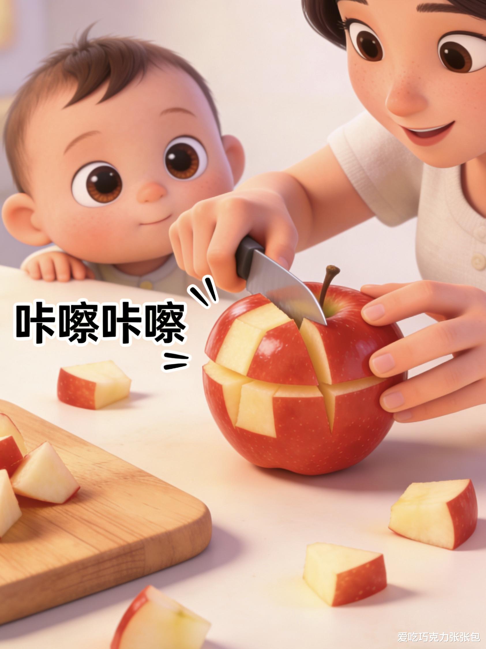“妈妈在切红色的苹果,咔嚓咔嚓,好脆啊!宝宝想尝尝吗?”(用颜色、声音等细节,帮助宝宝建立词汇与实物的联系)