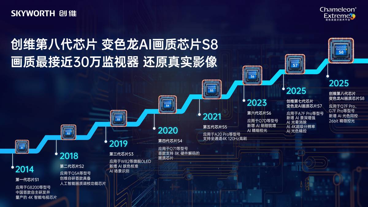 在电视行业,拥有自研画质芯片能力的企业屈指可数。创维从2014年推出中国首款自研4K智能电视芯片,到2018年开创性的变色龙AI画质芯片,再到如今第八代芯片的成熟应用,这条技术路径的背后,是长达37年的画质理解积累。