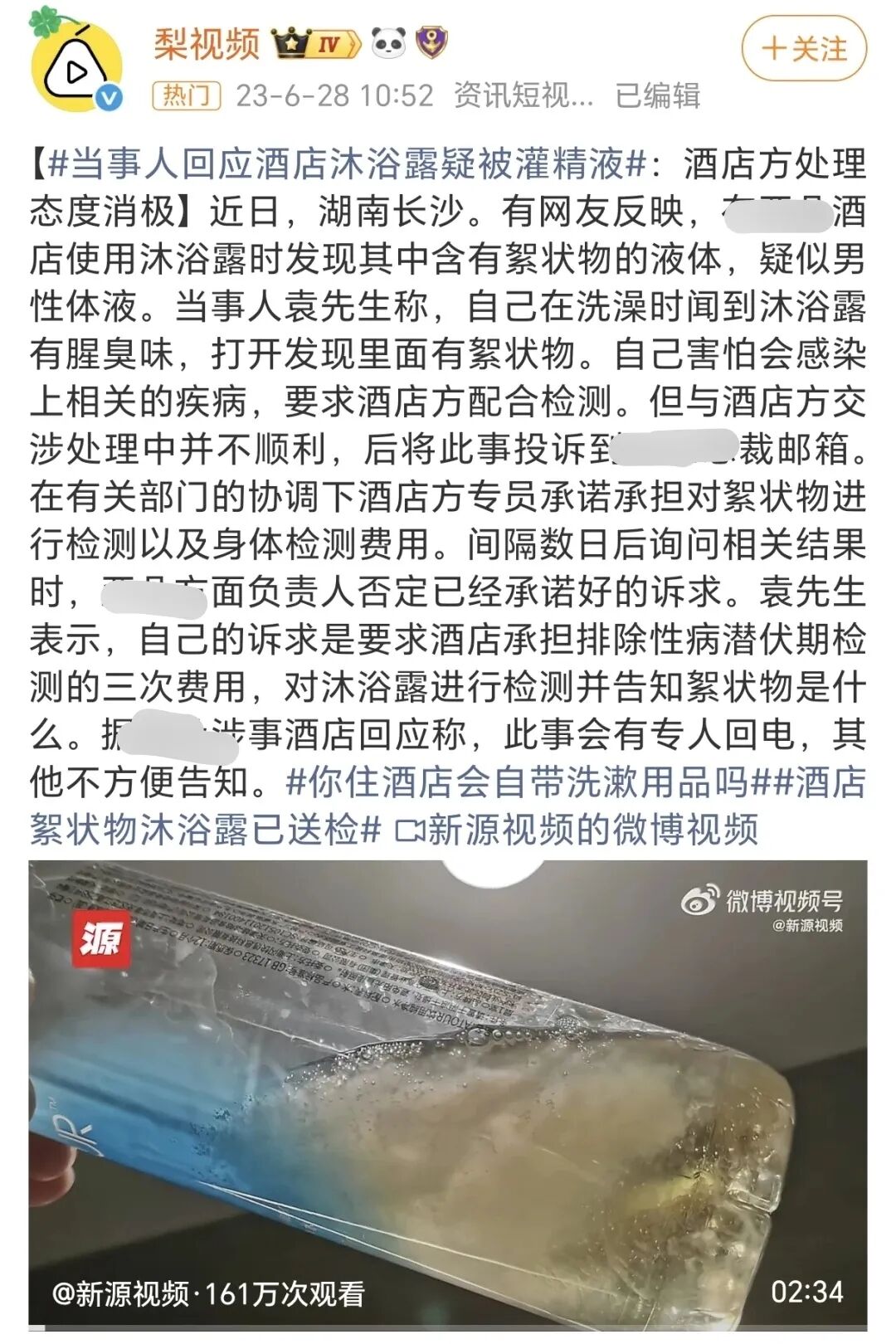 |层出不穷的酒店恶意事件:长沙某酒店被曝沐浴露中出现白色絮状物,疑似被灌入不明液体;住客在某酒店的洗漱包内发现了带有血迹的 HIV 检测试剂盒……